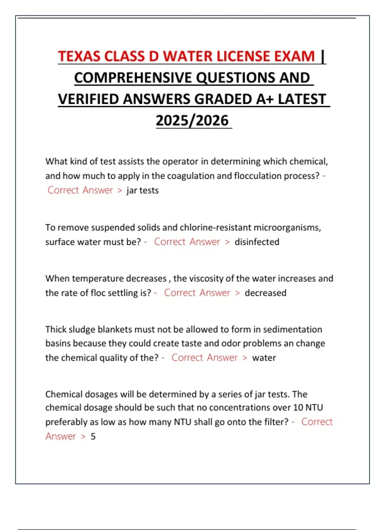 This document contains the complete set of verified and up-to-date practice questions and answers for the Texas Class D Water License Exam, valid for 2025/2026. It covers essential topics such as coagulation and flocculation, sedimentation, filtration, disinfection, groundwater and surface water management, and TCEQ (Texas Commission on Environmental Quality) regulations. The material is ideal for exam preparation, providing accurate answers and practical examples directly aligned with the official Texas water operator requirements.