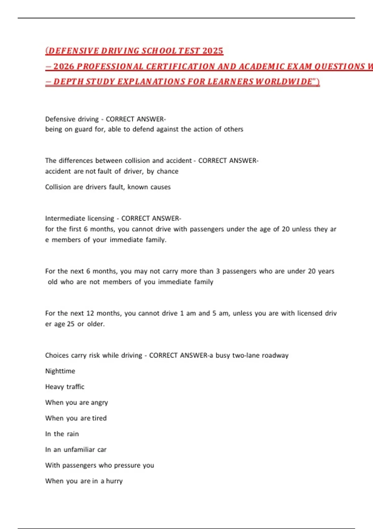 This document includes the complete 2025–2026 Defensive Driving School Test, featuring verified correct answers and detailed explanations for every question. It covers essential topics such as road safety, traffic laws, hazard recognition, accident prevention, and defensive driving strategies. Ideal for students and professionals preparing for official driving school assessments, certification exams, or refresher training programs worldwide.