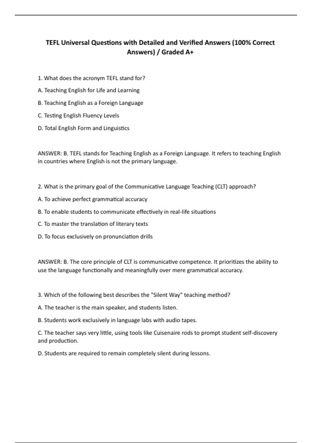 ANSWER: B. TEFL stands for Teaching English as a Foreign Language. It refers to teaching English