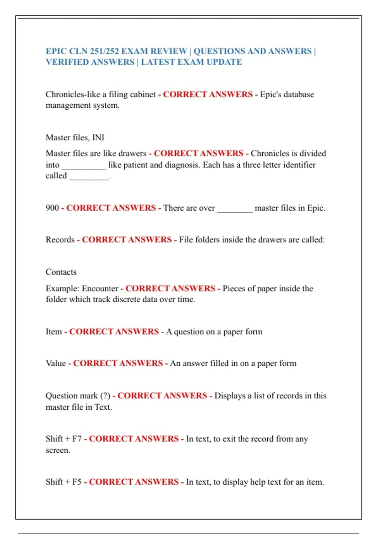 EPIC CLN 251/252 EXAM REVIEW | QUESTIONS AND ANSWERS |