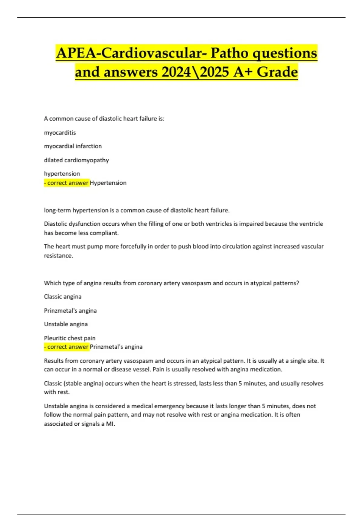 APEA – Cardiovascular Pathophysiology Exam | Verified Actual Questions & Correct Answers | Latest A+ Grade 2024/2025