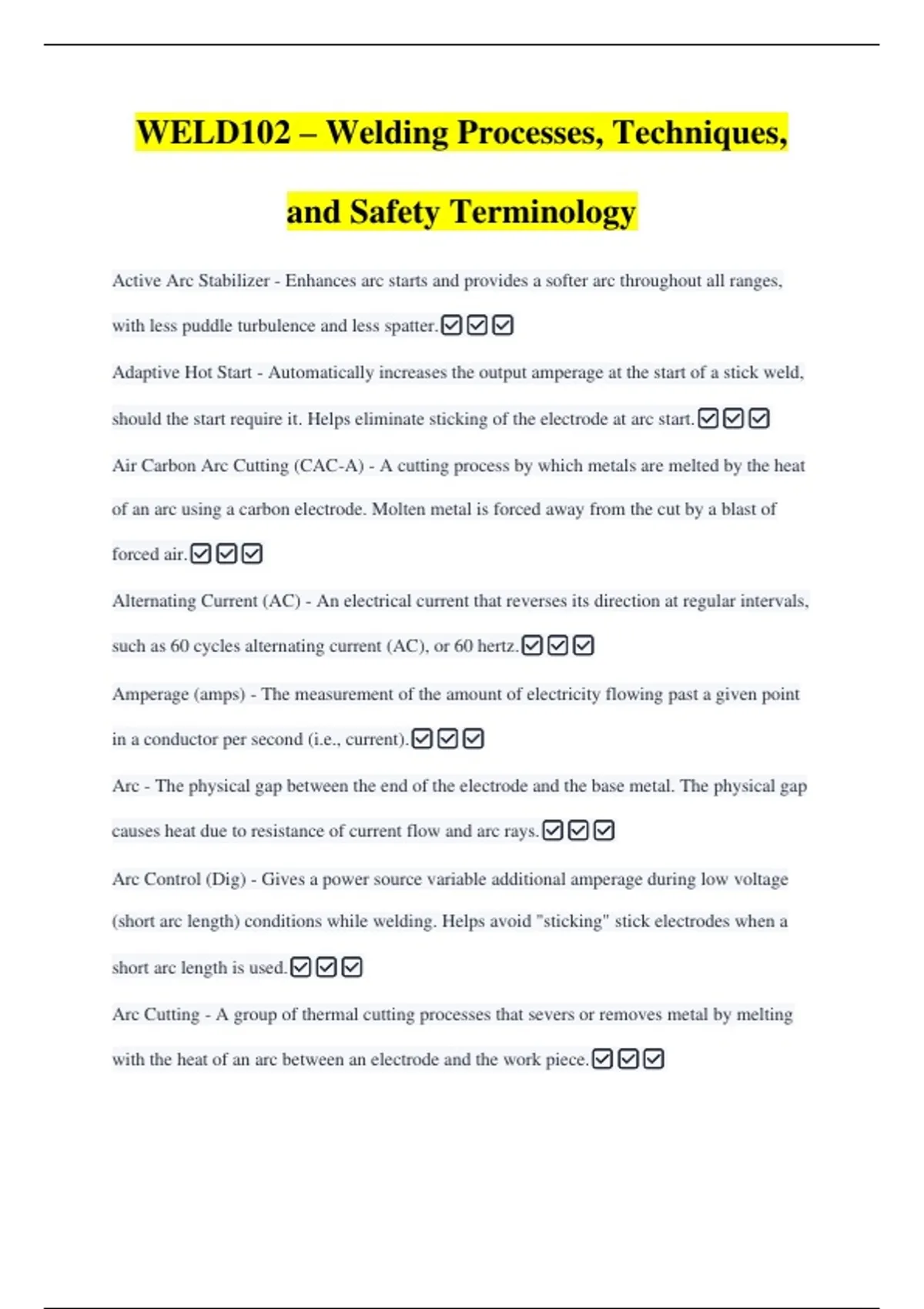 This comprehensive welding glossary provides detailed explanations of welding processes, techniques, equipment, and safety practices used across various industries. It covers arc, gas, plasma, resistance, and hybrid welding methods, including TIG, MIG, SMAW, FCAW, PAW, SAW, and thermite welding. Key welding concepts such as arc stabilization, amperage, voltage, duty cycle, and shielding gases are defined, along with welding joint types, contours, and weld defects. The glossary also addresses modern automation technologies, welding sequences, nondestructive and destructive testing, and safety precautions, emphasizing proper equipment handling, appropriate filler material use, and techniques to ensure high-quality, structurally sound welds. True/false statements and procedural notes illustrate practical applications and safety requirements in real-world welding scenarios.