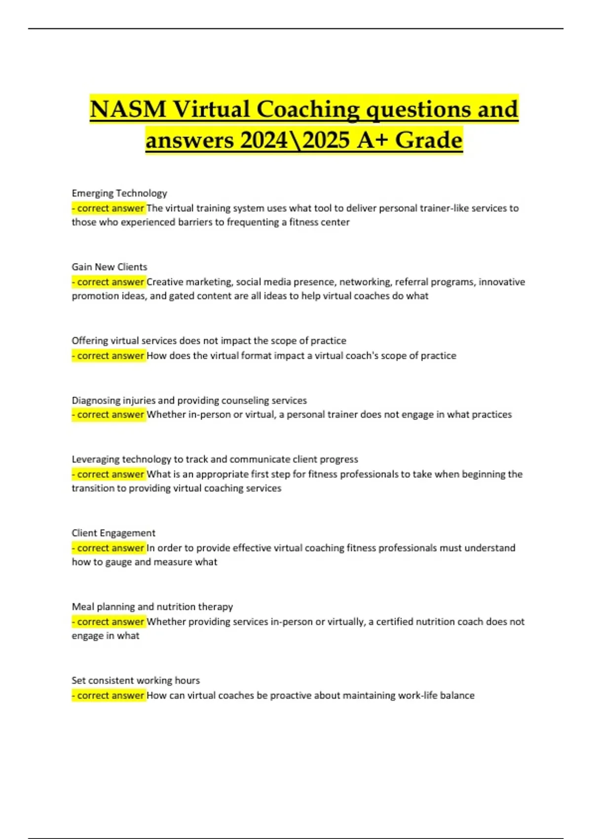 The NASM Virtual Coaching Exam (2024/2025 Edition) is a verified, A+ graded study guide with actual exam-style questions and correct answers. It covers online training strategies, client engagement, technology platforms, business practices, and ethical responsibilities, ensuring candidates are fully prepared to pass NASM’s Virtual Coaching certification.The NASM Virtual Coaching Certification equips fitness professionals to deliver safe, effective, and engaging training sessions online. This exam evaluates knowledge of technology tools, communication strategies, business models, and client safety protocols. The verified study guide provides real exam-style questions with detailed rationales, already graded A+, making it a trusted prep tool for guaranteed success.