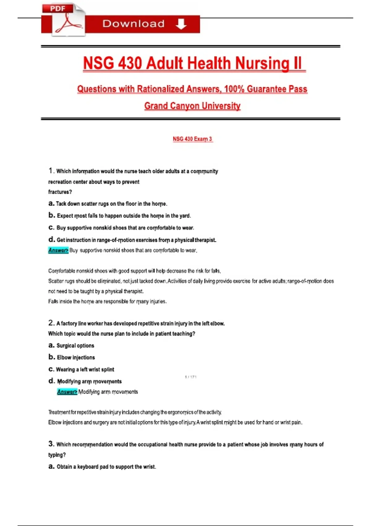Instant Download PDF – NSG 430 Adult Health Nursing II (Grand Canyon University 2026). This complete question-and-answer guide contains verified, rationalized solutions to help nursing students master the 2026 GCU Adult Health Nursing II course. Built around NGN-style items and real clinical case scenarios, it strengthens understanding of medical-surgical nursing concepts and evidence-based practice. NSG 430 Exam, Adult Health Nursing II, Grand Canyon University NSG 430, GCU Nursing Exam, Medical Surgical Nursing, Nursing Exam 2026, Adult Health Exam, Nursing Test Bank, Rationalized Answers, Nursing Study Guide, GCU Nursing Review, Clinical Case Scenarios, NGN Style Questions, Adult Health Review, Nursing Exam Prep, Med Surg Exam, Nursing Practice Test, Nursing Review Pack, Actual Qs and Ans, Health Nursing II adult health, nursing exam, test bank, gcu nursing, nsg 430, rational answers, nursing review, exam prep, case scenarios, medical surgical