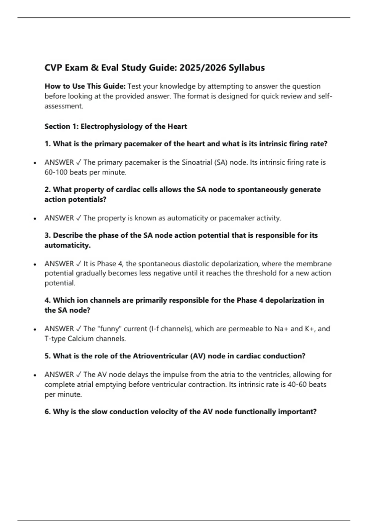 CVP Exam & Eval Study Guide: 2025/2026 Syllabus How to Use This Guide: Test your knowledge by attempting to answer the question before looking at the provided answer. The format is designed for quick review and selfassessment. Section 1: Electrophysiology of the Heart 1. What is the primary pacemaker of the heart and what is its intrinsic firing rate?  ANSWER The primary pacemaker is the Sinoatrial (SA) node. Its intrinsic firing rate is 60-100 beats per minute. 2. What property of cardiac cells allows the SA node to spontaneously generate action potentials?  ANSWER The property is known as automaticity or pacemaker activity. 3. Describe the phase of the SA node action potential that is responsible for its automaticity.  ANSWER It is Phase 4, the spontaneous diastolic depolarization, where the membrane potential gradually becomes less negative until it reaches the threshold for a new action potential. 4. Which ion channels are primarily responsible for the Phase 4 depolarization in the SA node?  ANSWER The "funny" current (I-f channels), which are permeable to Na+ and K+, and T-type Calcium channels. 5. What is the role of the Atrioventricular (AV) node in cardiac conduction?  ANSWER The AV node delays the impulse from the atria to the ventricles, allowing for complete atrial emptying before ventricular contraction. Its intrinsic rate is 40-60 beats per minute. 6. Why is the slow conduction velocity of the AV node functionally important?  ANSWER The slow conduction ensures a critical delay (approximately 0.1 seconds) that allows the atria to contract and fully eject blood into the ventricles before ventricular systole begins. 7. What are the Purkinje fibers and what is their intrinsic firing rate?  ANSWER Purkinje fibers are specialized, fast-conducting cardiac fibers that rapidly transmit the electrical impulse through the ventricular myocardium. Their intrinsic rate is 15-40 beats per minute. 8. Define the absolute refractory period in a cardiac myocyte.  ANSWER It is the period during which no stimulus, no matter how strong, can elicit another action potential. This prevents tetanic contraction and allows the heart to refill. 9. How does the ventricular myocyte action potential differ from the SA node action potential?  ANSWER Ventricular myocytes have a stable resting potential (Phase 4), a very rapid upstroke (Phase 0) due to fast Na+ channels, and a long plateau (Phase 2) due to Ca2+ influx, which is absent in SA node cells. 10. What is the "pacemaker potential" and where does it occur?  ANSWER The pacemaker potential is the spontaneous, gradual depolarization of the membrane potential during Phase 4 in autorhythmic cells like those in the SA and AV nodes