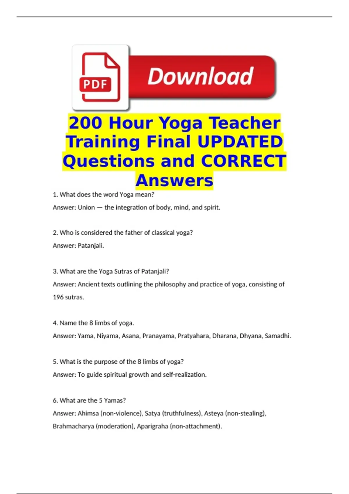 200 Hour Yoga Teacher Training Final UPDATED Questions and CORRECT Answers