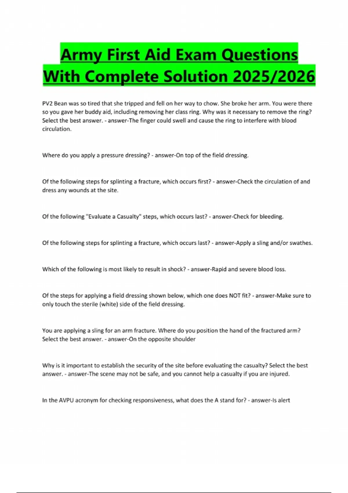 Army First Aid Exam Questions With Complete Solution 2025/2026 PV2 Bean was so tired that she tripped and fell on her way to chow. She broke her arm. You were there so you gave her buddy aid, including removing her class ring. Why was it necessary to remove the ring? Select the best answer. - answer-The finger could swell and cause the ring to interfere with blood circulation. Where do you apply a pressure dressing? - answer-On top of the field dressing. Of the following steps for splinting a fracture, which occurs first? - answer-Check the circulation of and dress any wounds at the site. Of the following "Evaluate a Casualty" steps, which occurs last? - answer-Check for bleeding. Of the following steps for splinting a fracture, which occurs last? - answer-Apply a sling and/or swathes. Which of the following is most likely to result in shock? - answer-Rapid and severe blood loss. Of the steps for applying a field dressing shown below, which one does NOT fit? - answer-Make sure to only touch the sterile (white) side of the field dressing. You are applying a sling for an arm fracture. Where do you position the hand of the fractured arm? Select the best answer. - answer-On the opposite shoulder Why is it important to establish the security of the site before evaluating the casualty? Select the best answer. - answer-The scene may not be safe, and you cannot help a casualty if you are injured. In the AVPU acronym for checking responsiveness, what does the A stand for? - answer-Is alertBelow are some statements related to field dressings and pressure dressings. Which one is correct? - answer-Tie the knot for a pressure dressing over the wound.