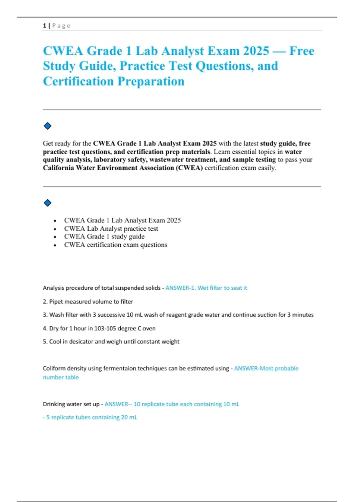 Get ready for the CWEA Grade 1 Lab Analyst Exam 2025 with the latest study guide, free