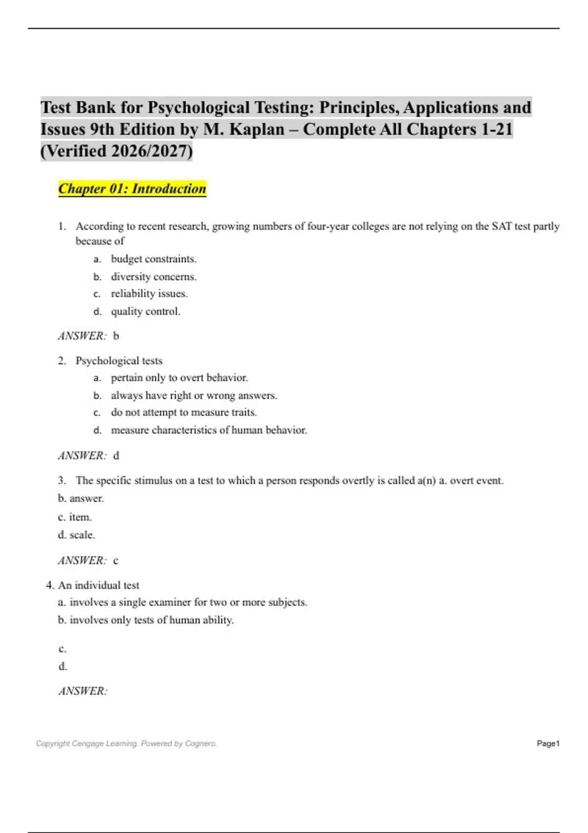 Test Bank for Psychological Testing: Principles, Applications, and Issues 9th Edition by M. Kaplan – Complete All Chapters 1-21 (Verified 2026/2027) 1. According to recent research, growing numbers of four-year colleges are not relying on the SAT test partly because of a. budget constraints. b. diversity concerns. c. reliability issues. d. quality control. ANSWER: b 2. Psychological tests a. pertain only to overt behavior. b. always have right or wrong answers. c. do not attempt to measure traits. d. measure characteristics of human behavior. ANSWER: d 3. The specific stimulus on a test to which a person responds overtly is called a(n) a. overt event. b. answer. c. item. d. scale. ANSWER: c 4. An individual test a. involves a single examiner for two or more subjects. b. involves only tests of human ability. Name: Class: Date: Chapter 01: Introduction Copyright Cengage Learning. Powered by Cognero. Page2 c. can be given to only one person at a time. d. involves more than one examiner for a single subject. ANSWER: c 6. Previous learning can best be described as a. achievement. b. aptitude. c. intelligence. d. ability. ANSWER: a 7. The potential for learning a specific skill can best be described as a. achievement. b. aptitude. c. intelligence. d. ability. ANSWER: b 8. One’s general potential, independent of prior learning, can best be described as a. achievement. b. aptitude. c. intelligence. d. ability. ANSWER: c 9. Achievement, aptitude, and intelligence can be encompassed by the term a. human potential. b. human traits. c. human personality. d. human ability. ANSWER: d 10. Structured personality tests a. require you to produce something spontaneously. c. d. ANSWER: Copyright Cengage Learning. Powered by Cognero. Page3 b. require you to choose between two or more alternative responses. c. involve an ambiguous test stimulus about which the response is structured. d. involve an ambiguous test response. ANSWER: b 11. The main purpose of psychological testing is to evaluate a. covert behavior. b. individual differences. c. personality traits. d. overt behavior. ANSWER: b 12. Projective personality tests a. provide a statement, usually of the self-report variety. b. require the subject to choose between two or more alternative responses. c. are unstructured. d. are structured. ANSWER: c 5. A group test a. can be given to multiple people by one examiner. b. can be given to only three people at a time. involves a group of examiners for a single subject. involves only tests of human ability. a 13. Tests that measure an individual’s typical behavior are called a. ability tests. b. personality tests. c. intelligence tests. d. group tests. Name: Class: Date: Chapter 01: Introduction Copyright Cengage Learning. Powered by Cognero. Page4 ANSWER: b 14. Tests that provide a statement, usually of the self-report variety, and require the subject to choose between two or more alternative responses, are called a. group tests. b. individual tests. c. structured personality tests. d. projective personality tests. ANSWER: c 15. Personality tests in which the test stimulus and/or required response are ambiguous are called a. projective personality tests. b. structured personality tests. individual personality tests. achievement personality tests. a 16. Which of the following is true of tests? a. Tests produce explicit data that are subject to scientific study. b. Tests are successful in separating prior learning from potential for learning. c. Very few tests can actually predict behavior. d. Tests can provide insight into overt but not covert behavior. ANSWER: a 17. Which of the following relates raw test scores to theoretical or empirical distributions? a. Transforms b. Reliability c. Scales d. Theories ANSWER: c