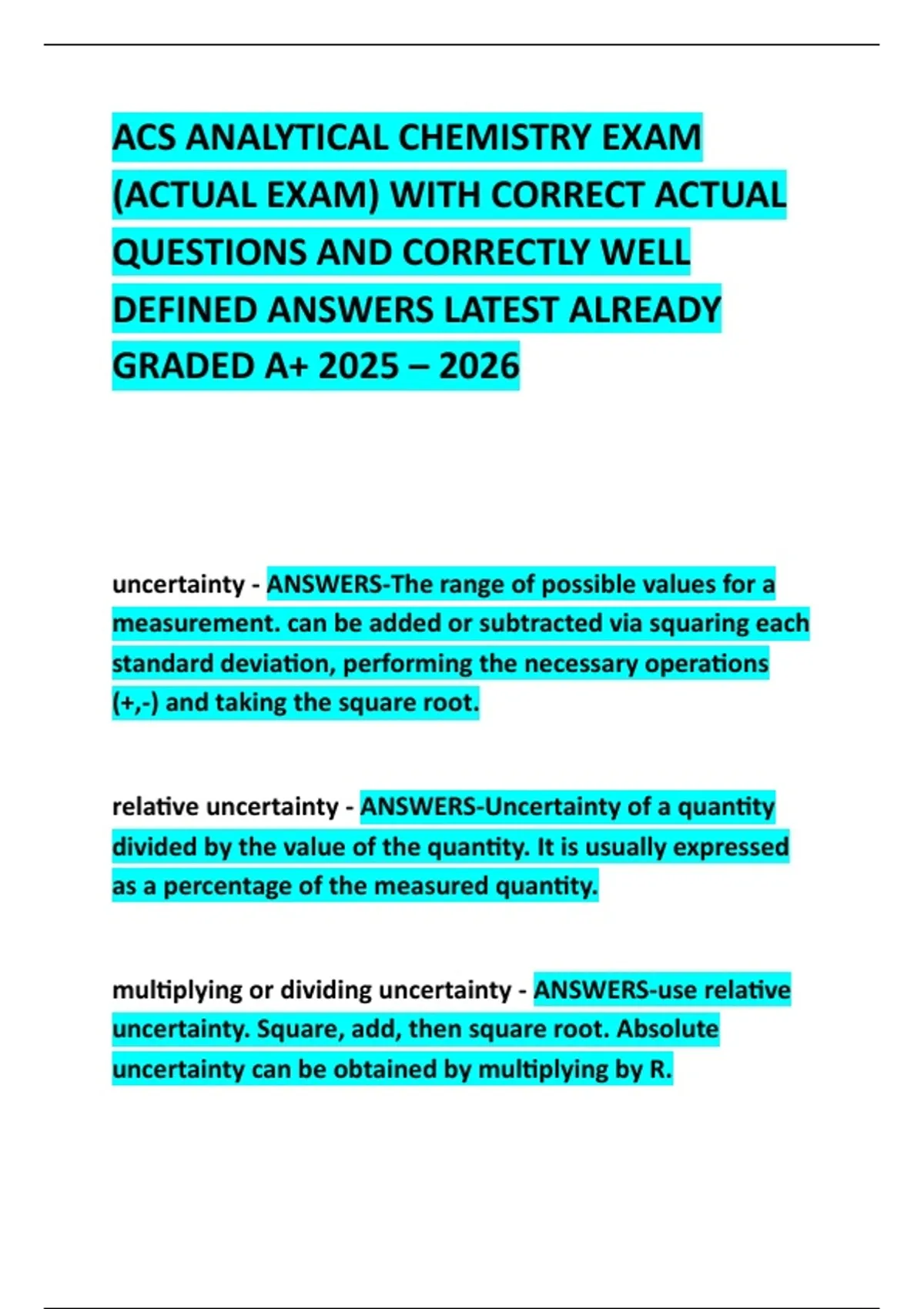 ACS ANALYTICAL CHEMISTRY EXAM (ACTUAL EXAM) WITH CORRECT ACTUAL QUESTIONS AND CORRECTLY WELL DEFINED ANSWERS LATEST ALREADY GRADED A+ 2025 – 2026