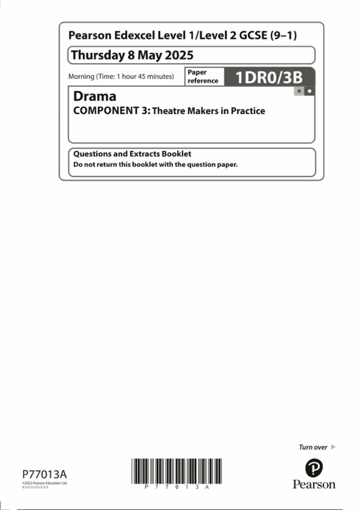 2025 PEARSON EDEXCEL GCSE DRAMA PAPER 3 QUESTION PAPER : Theatre Makers in Practice (1DR0/3B