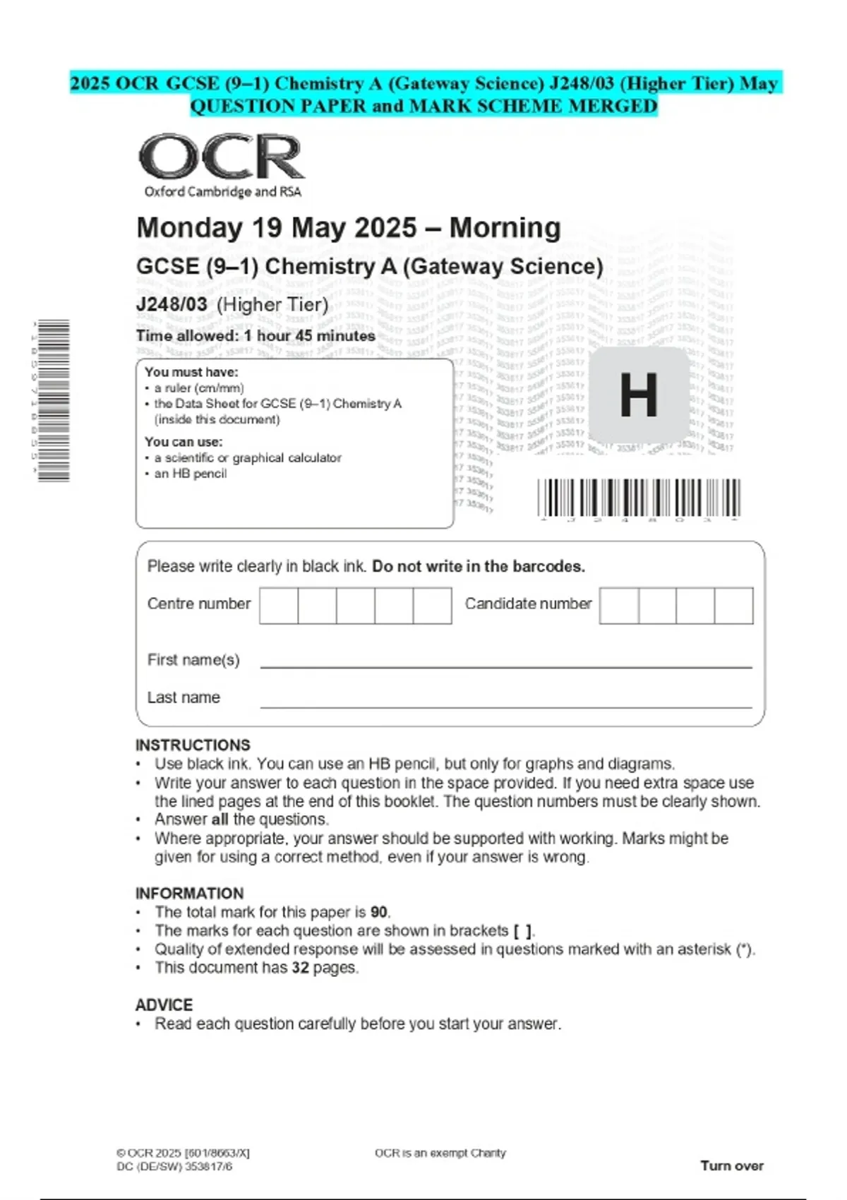 2025 OCR GCSE (9–1) Chemistry A (Gateway Science) J248/03 (Higher Tier) May QUESTION PAPER and MARK SCHEME MERGED