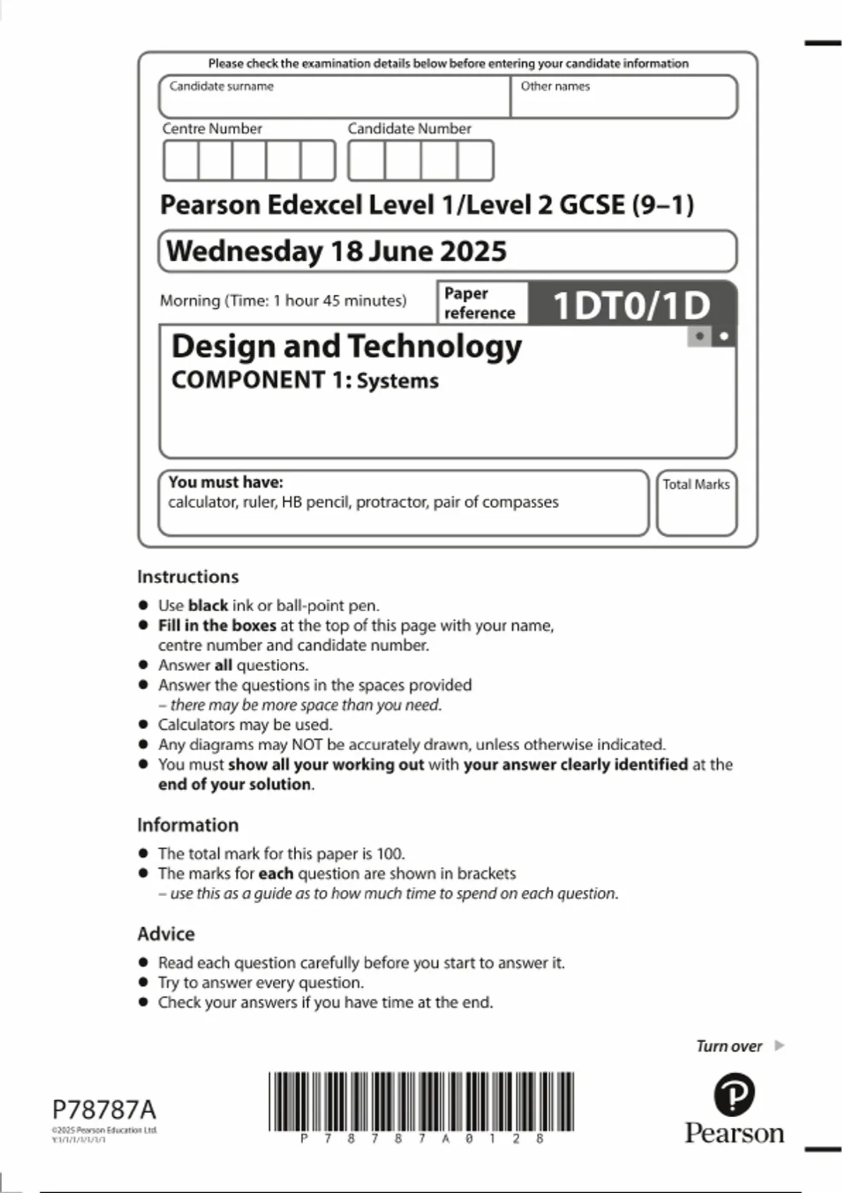 2025 PEARSON EDEXCEL GCSE Design and Technology PAPER 1 QUESTION PAPER : Systems (1DT0/1D
