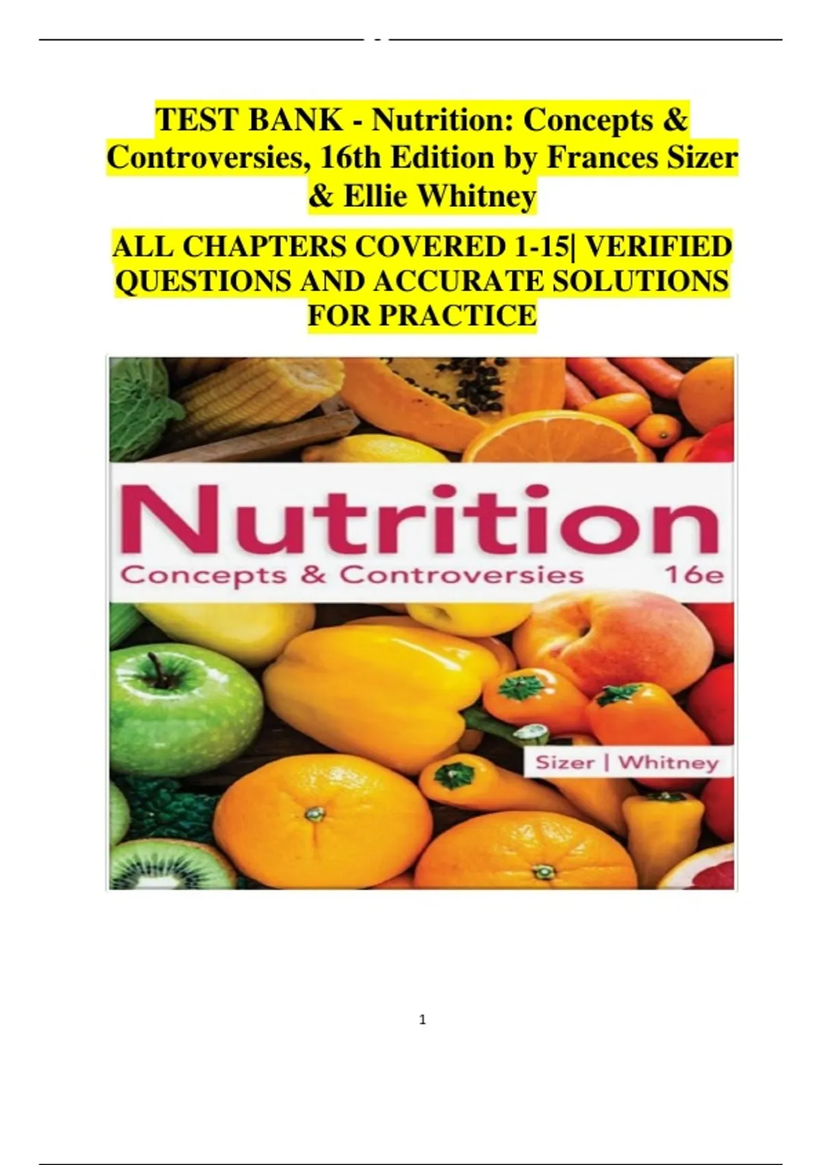 This comprehensive test bank for Nutrition: Concepts & Controversies (16th Edition) by Frances Sizer and Ellie Whitney contains verified multiple-choice, true/false, matching, and essay questions with detailed solutions for Chapters 1–15. It covers topics such as food choices, nutrient functions, dietary guidelines, metabolism, and life cycle nutrition. Ideal for exam preparation, practice quizzes, or in-depth review of key nutrition principles taught in undergraduate nutrition and dietetics courses.