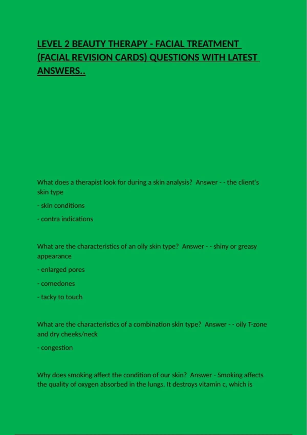 LEVEL 2 BEAUTY THERAPY - FACIAL TREATMENT (FACIAL REVISION CARDS) QUESTIONS WITH LATEST ANSWERS..