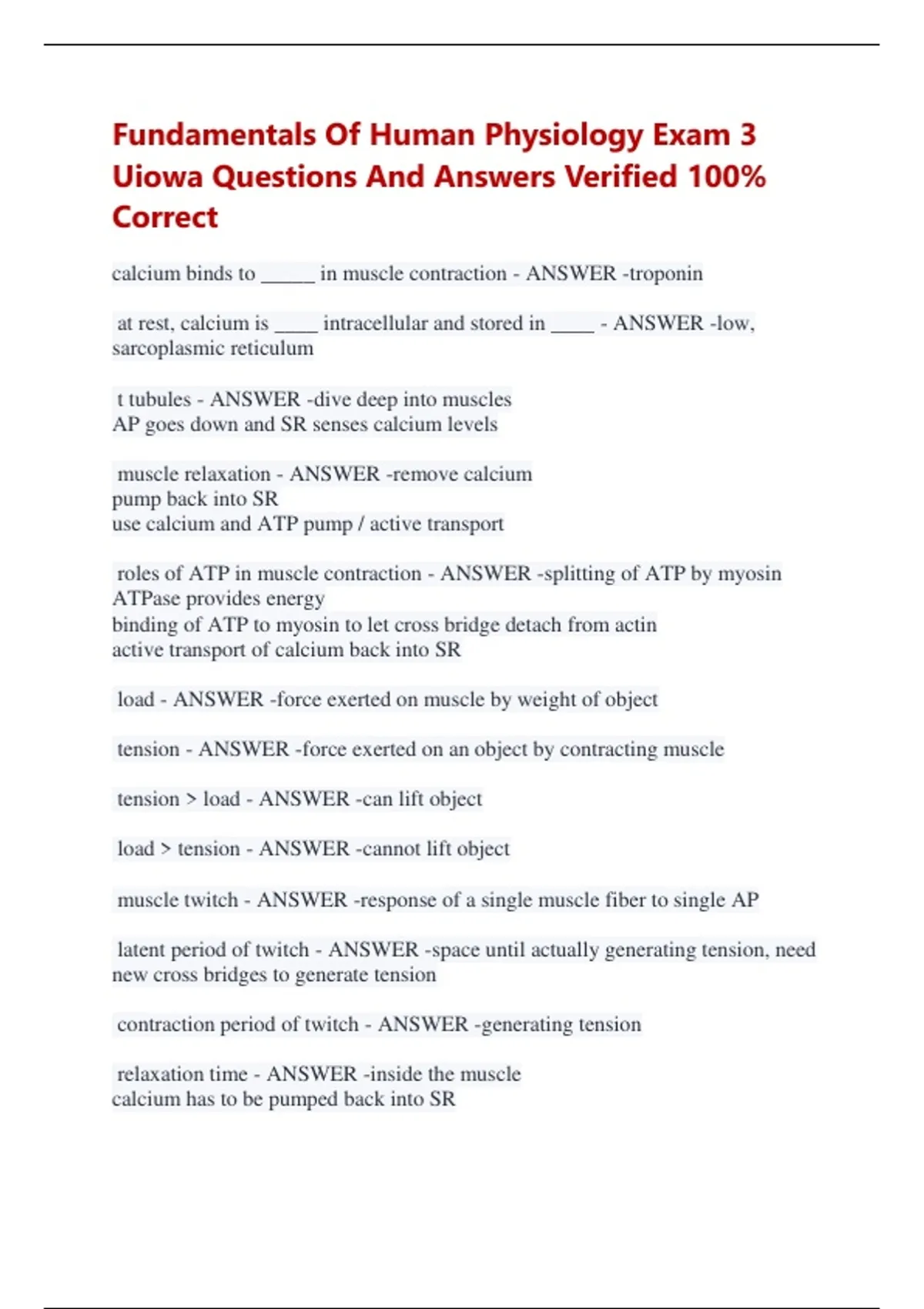 Fundamentals Of Human Physiology Exam 3 Uiowa Questions And Answers Verified 100% Correct
