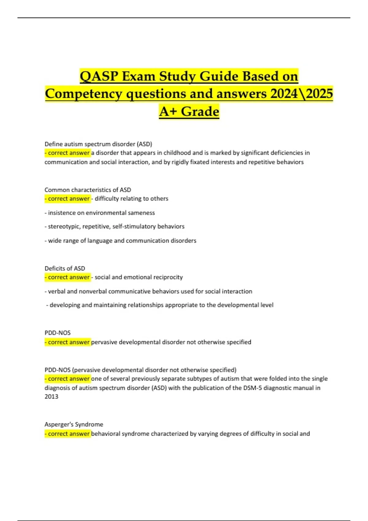 The QASP Certification Exam evaluates knowledge and skills required for professionals working in autism services and applied behavior analysis. This study guide provides real exam-style questions with detailed rationales, already graded A+, making it a trusted prep tool for guaranteed success. Learning Outcomes: Apply ABA principles to behavior intervention plans. Understand competency-based practice standards for autism services. Demonstrate ethical and professional responsibilities in client care. Use data collection and analysis to inform treatment decisions. Recognize behavioral assessment tools and intervention strategies