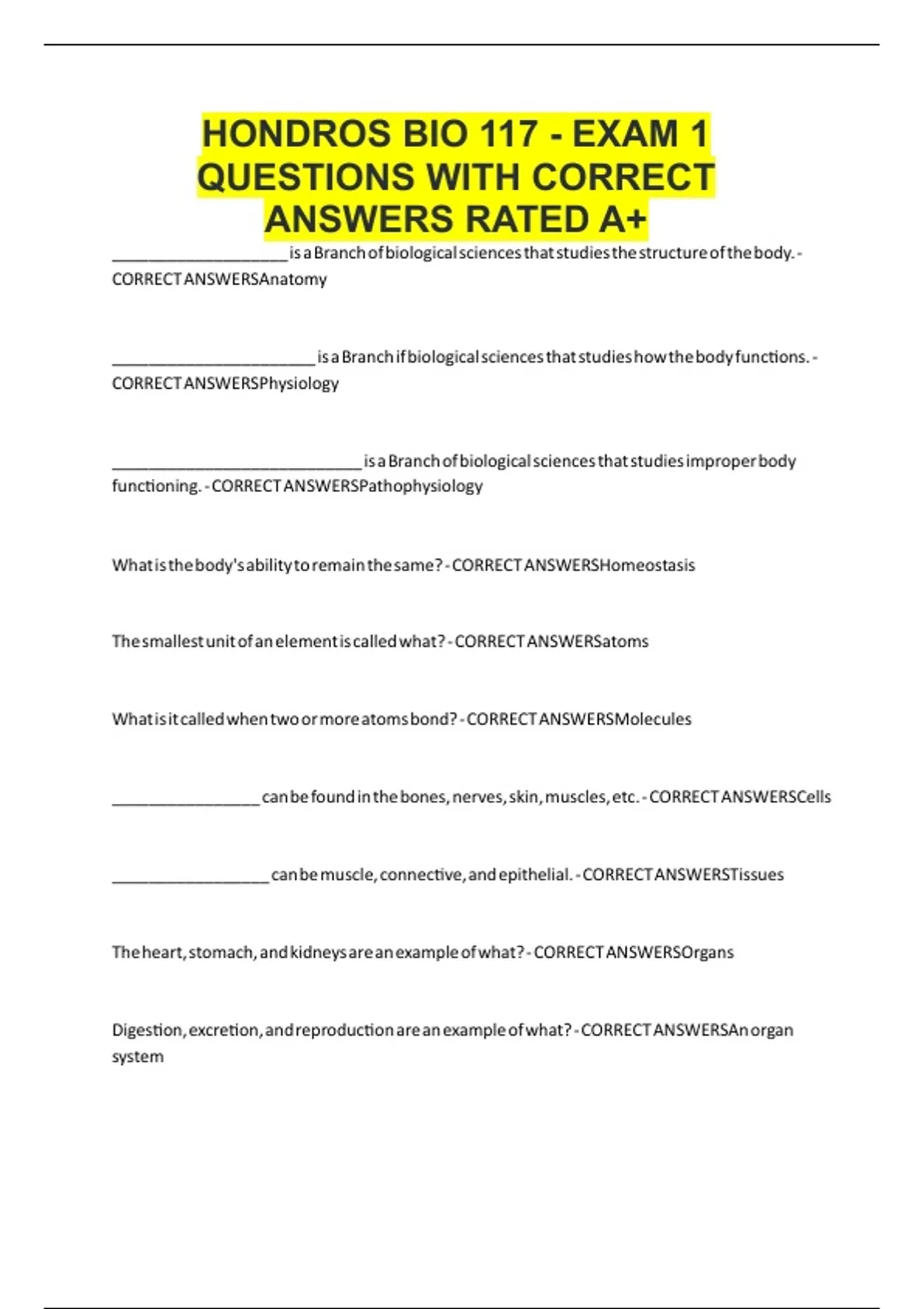HONDROS BIO 117 - EXAM 1 QUESTIONS WITH CORRECT ANSWERS RATED A+.pdf