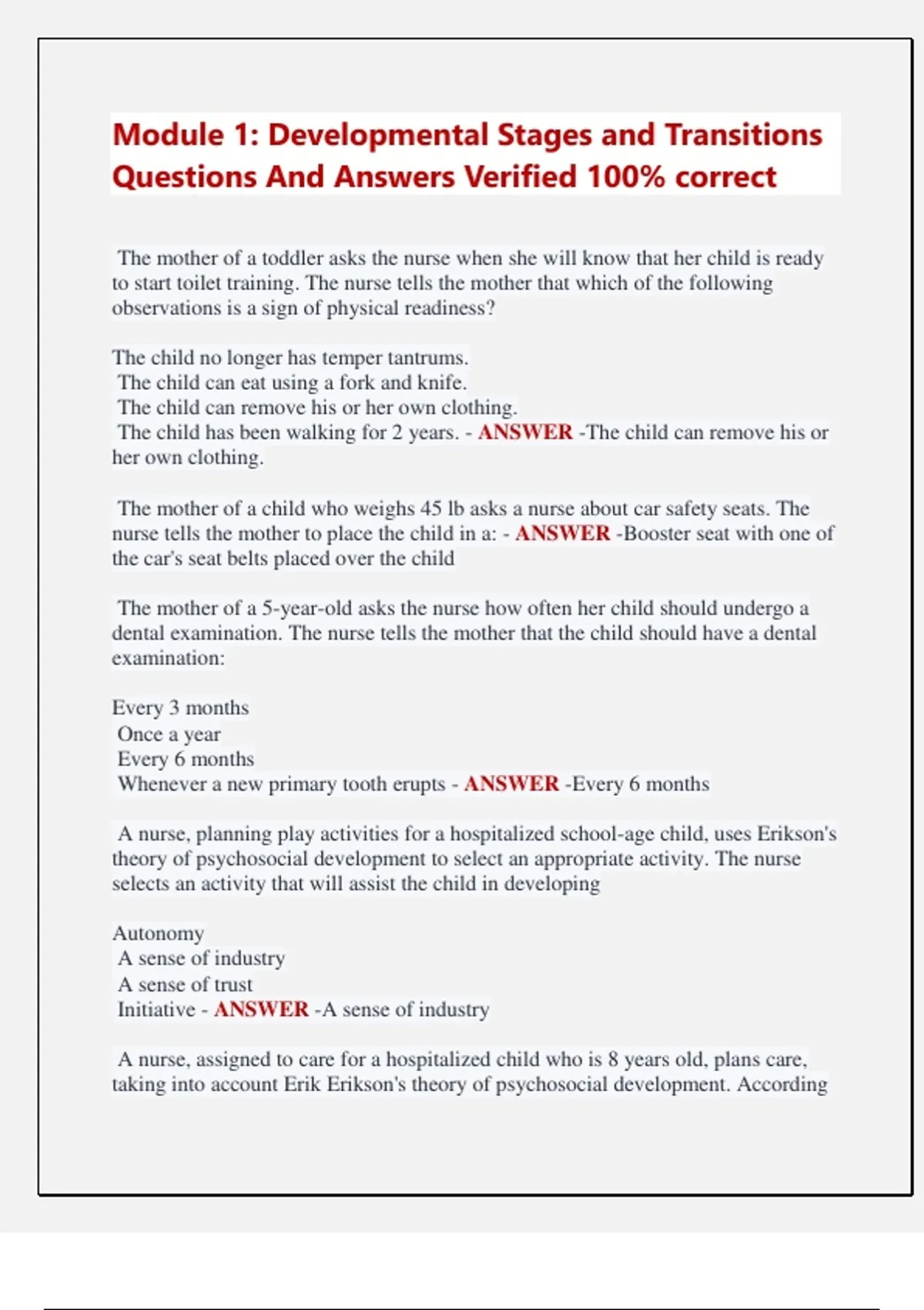 Module 1: Developmental Stages and Transitions Exam Study Guide Questions And Answers Verified 100% Correct
