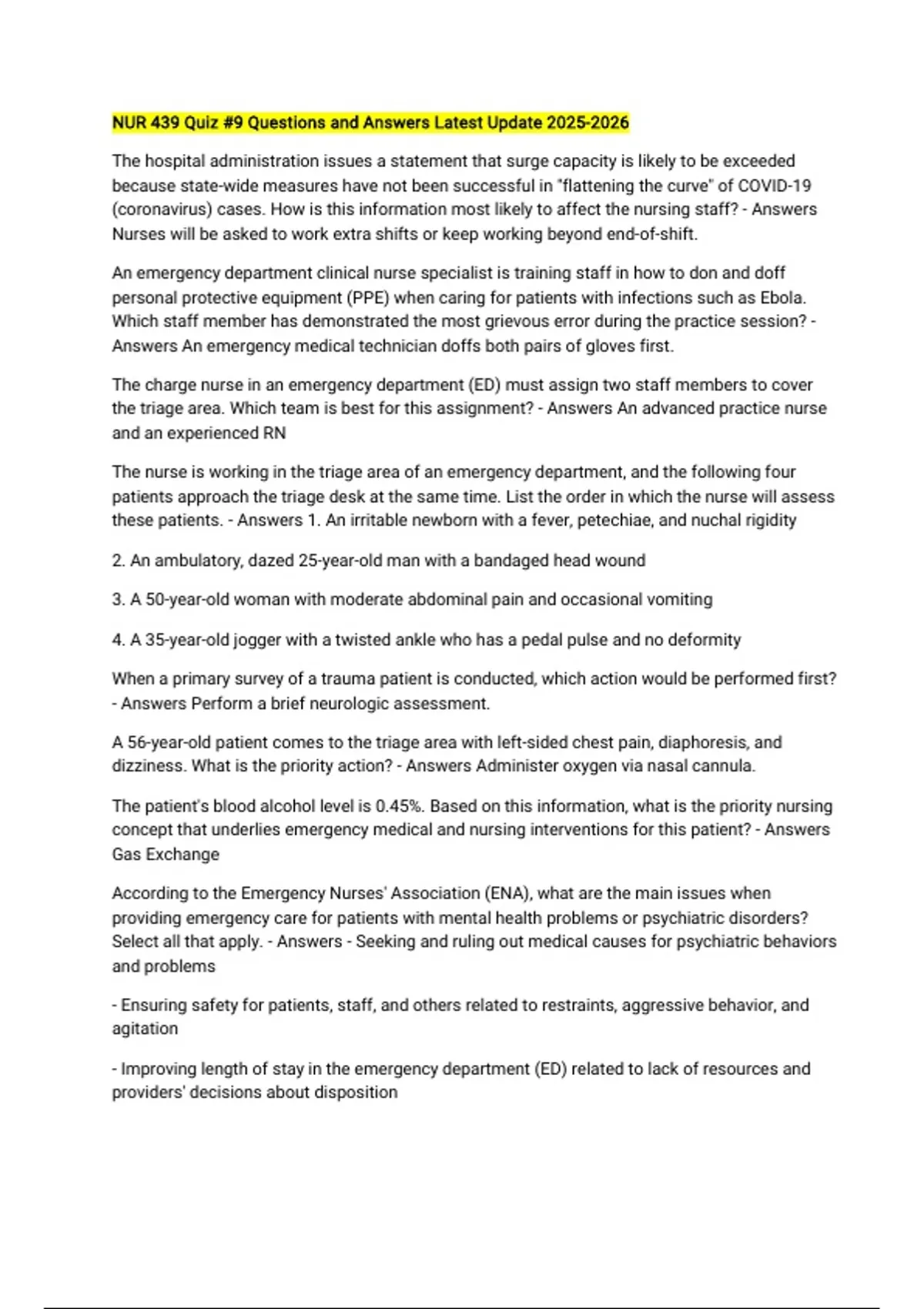 NUR 439 Quiz #9 Questions and Answers Latest Update The hospital administration issues a statement that surge capacity is likely to be exceeded because state-wide measures have not been successful in "flattening the curve" of COVID-19 (coronavirus) cases. How is this information most likely to affect the nursing staff? - Answers Nurses will be asked to work extra shifts or keep working beyond end-of-shift. An emergency department clinical nurse specialist is training staff in how to don and doff personal protective equipment (PPE) when caring for patients with infections such as Ebola. Which staff member has demonstrated the most grievous error during the practice session? - Answers An emergency medical technician doffs both pairs of gloves first. The charge nurse in an emergency department (ED) must assign two staff members to cover the triage area. Which team is best for this assignment? - Answers An advanced practice nurse and an experienced RN The nurse is working in the triage area of an emergency department, and the following four patients approach the triage desk at the same time. List the order in which the nurse will assess these patients. - Answers 1. An irritable newborn with a fever, petechiae, and nuchal rigidity 2. An ambulatory, dazed 25-year-old man with a bandaged head wound 3. A 50-year-old woman with moderate abdominal pain and occasional vomiting 4. A 35-year-old jogger with a twisted ankle who has a pedal pulse and no deformity When a primary survey of a trauma patient is conducted, which action would be performed first? - Answers Perform a brief neurologic assessment. A 56-year-old patient comes to the triage area with left-sided chest pain, diaphoresis, and dizziness. What is the priority action? - Answers Administer oxygen via nasal cannula. The patient's blood alcohol level is 0.45%. Based on this information, what is the priority nursing concept that underlies emergency medical and nursing interventions for this patient? - Answers Gas Exchange According to the Emergency Nurses' Association (ENA), what are the main issues when providing emergency care for patients with mental health problems or psychiatric disorders? Select all that apply. - Answers - Seeking and ruling out medical causes for psychiatric behaviors and problems - Ensuring safety for patients, staff, and others related to restraints, aggressive behavior, and agitation - Improving length of stay in the emergency department (ED) related to lack of resources and providers' decisions about disposition - Establishing ongoing care after triage by dedicated psychiatric emergency nurses - Improving communication to describe symptoms and findings in hand-off, disposition, and follow-up care It is the summer season, and patients with signs and symptoms of heat-related illness come to the emergency department. Which patient needs attention first? - Answers Homeless person who displays altered mental status, poor muscle coordination, and hot, dry, ashen skin; duration of heat exposure is unknown The nurse responds to a call for help from the emergency department waiting room. An older adult patient is lying on the floor. List the order in which the nurse must carry out the following actions. - Answers 1. Establish unresponsiveness. 2. Call for help and activate the code team.