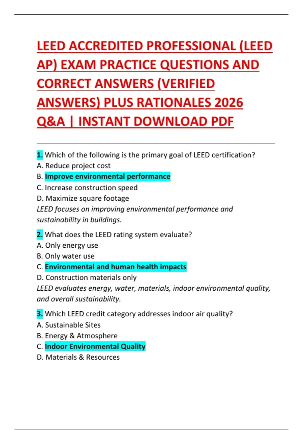 LEED ACCREDITED PROFESSIONAL (LEED AP) EXAM PRACTICE QUESTIONS AND CORRECT ANSWERS (VERIFIED ANSWERS) PLUS RATIONALES 2026 Q&A | INSTANT DOWNLOAD PDF