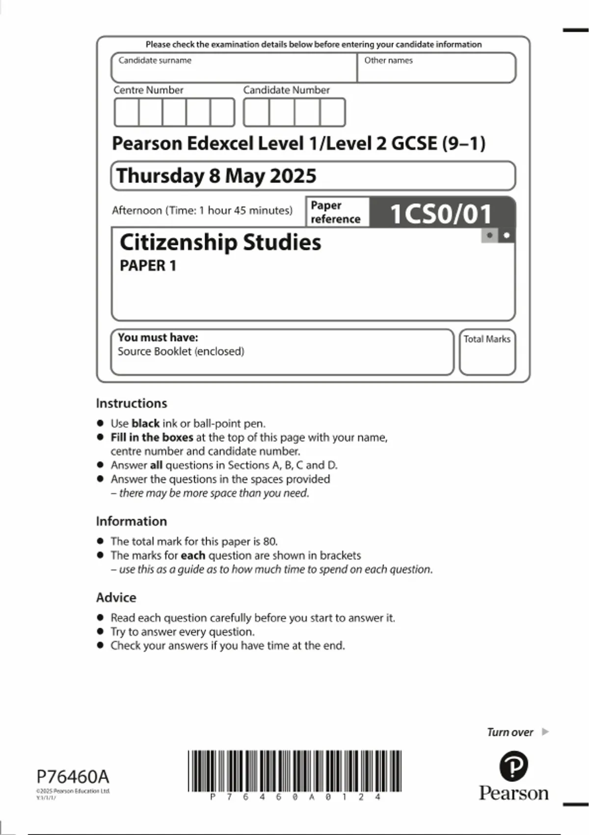 - 2024 Pearson Edexcel GCSE Citizenship Studies PAPE