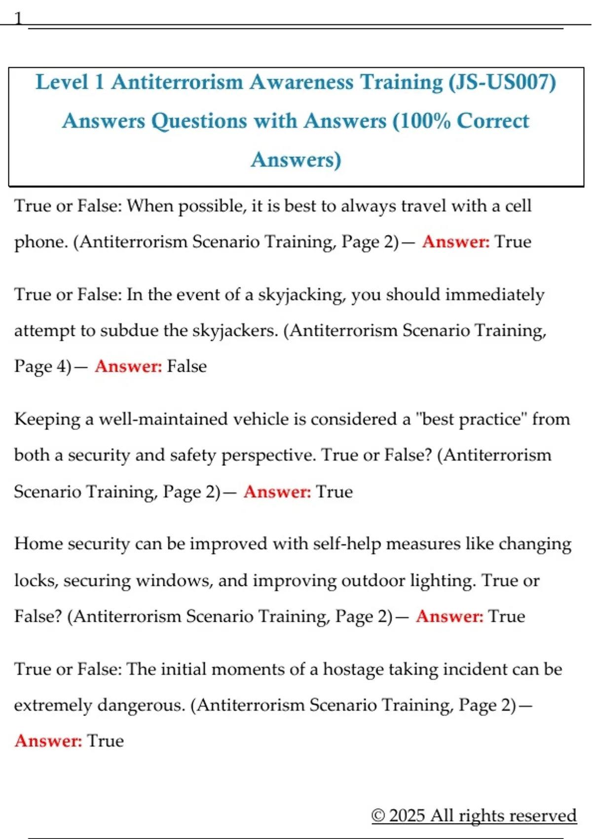 Level 1 Antiterrorism Awareness Training (JS-US007) Answers Questions with Answers (100% Correct Answers)Level 1 Antiterrorism Awareness Training (JS-US007) Answers Questions with Answers (100% Correct Answers)