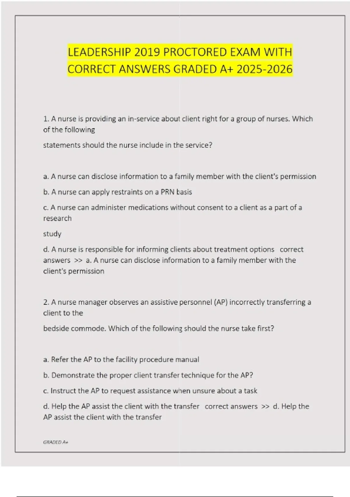 LEADERSHIP 2019 PROCTORED EXAM WITH CORRECT ANSWERS GRADED A+