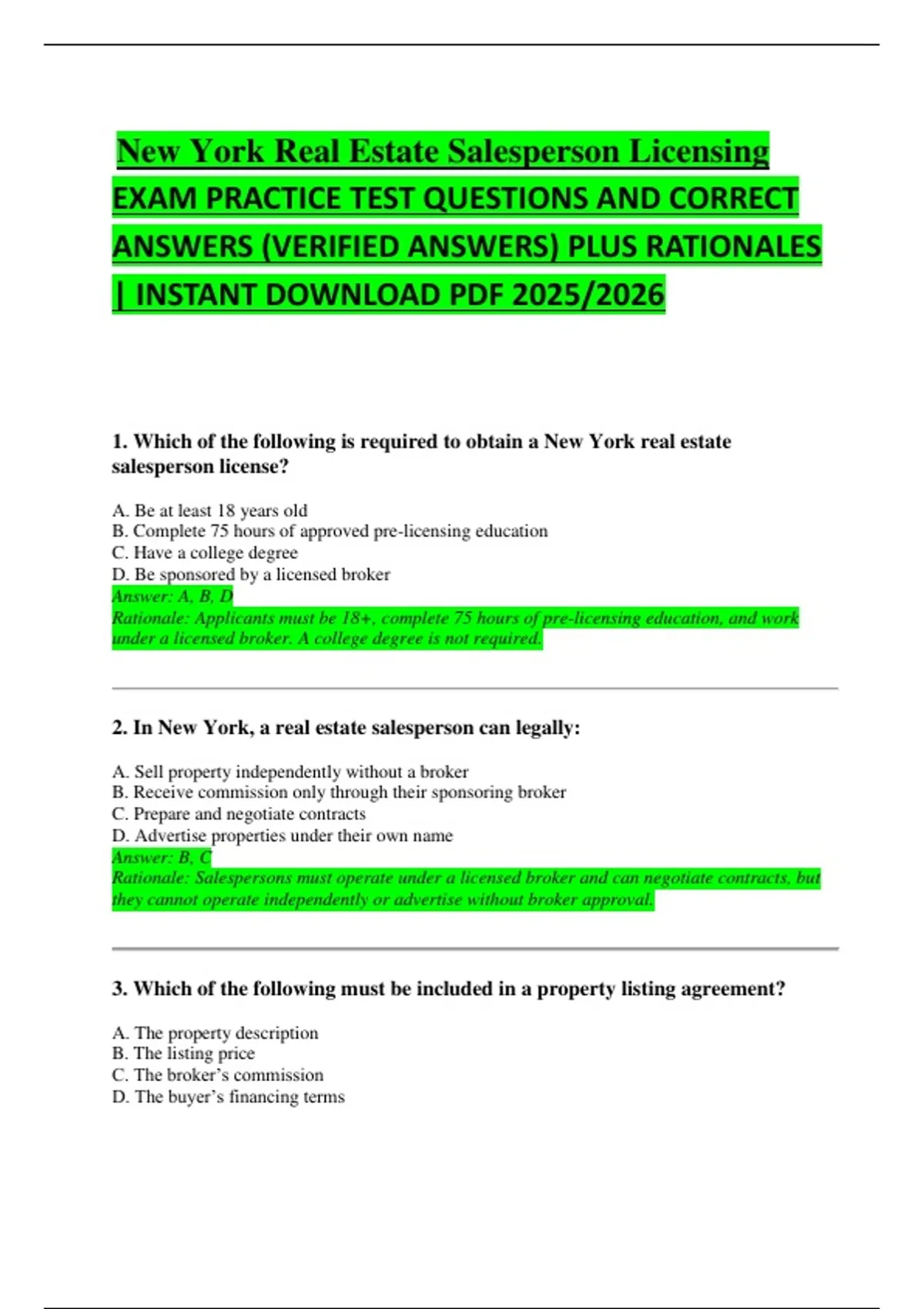 Rationale: Listings must include property details, price, and commission. Buyer financing terms