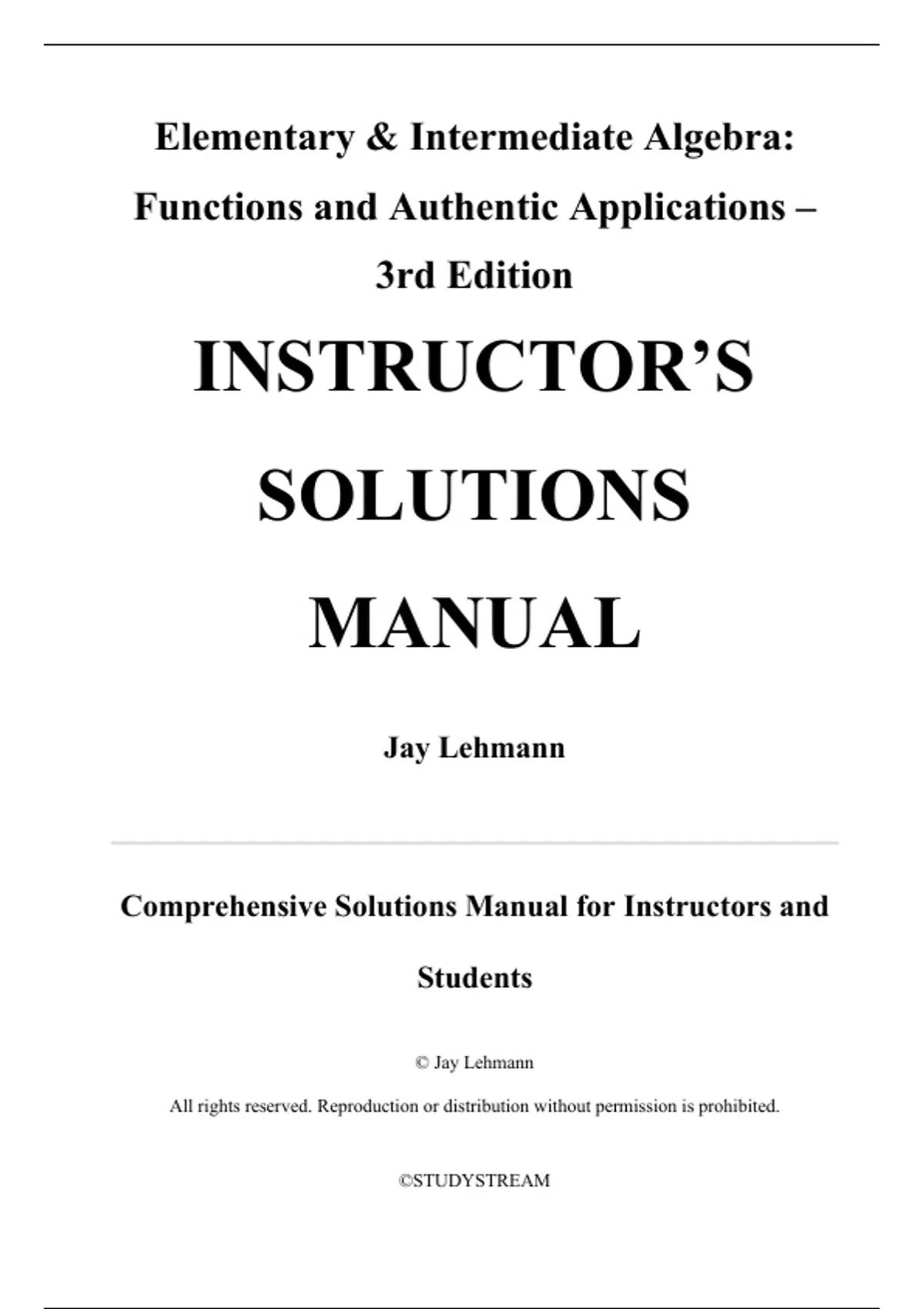 The Instructor’s Solutions Manual for Elementary & Intermediate Algebra: Functions and Authentic Applications, 3rd Edition by Jay Lehmann, provides complete, instructor-verified solutions to all textbook problems, organized section by section with full intermediate steps, conceptual explanations, and contextual modeling notes. This manual emphasizes Lehmann’s authentic, data-driven approach to algebra, integrating real-world “Taking It to the Lab” applications with algebraic concepts to promote understanding through modeling and function-based learning. The manual follows the official Pearson textbook structure, covering all major topics in continuous sequence: Chapter 1: Introduction to Modeling, Chapter 2: Operations and Expressions, Chapter 3: Using Slope to Graph Linear Equations, Chapter 4: Simplifying Expressions and Solving Equations, Chapter 5: Linear Functions and Linear Inequalities in One Variable, Chapter 6: Systems of Linear Equations and Systems of Linear Inequalities, Chapter 7: Polynomial Functions and Properties of Exponents, Chapter 8: Factoring Polynomials and Solving Polynomial Equations, Chapter 9: Quadratic Functions, Chapter 10: Exponential Functions, Chapter 11: Logarithmic Functions, Chapter 12: Rational Functions, Chapter 13: Radical Functions, Chapter 14: Sequences and Series, and Chapter 15: Additional Topics.