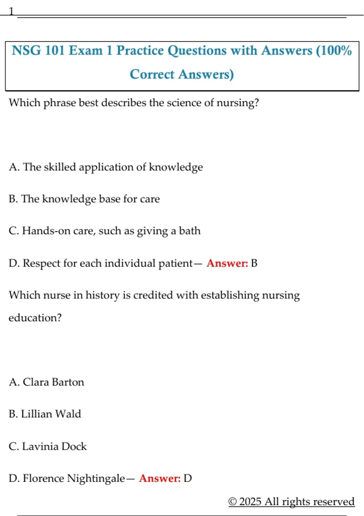 NSG 101 Exam 1 Practice Questions with Answers (100% Correct Answers)NSG 101 Exam 1 Practice Questions with Answers (100% Correct Answers)