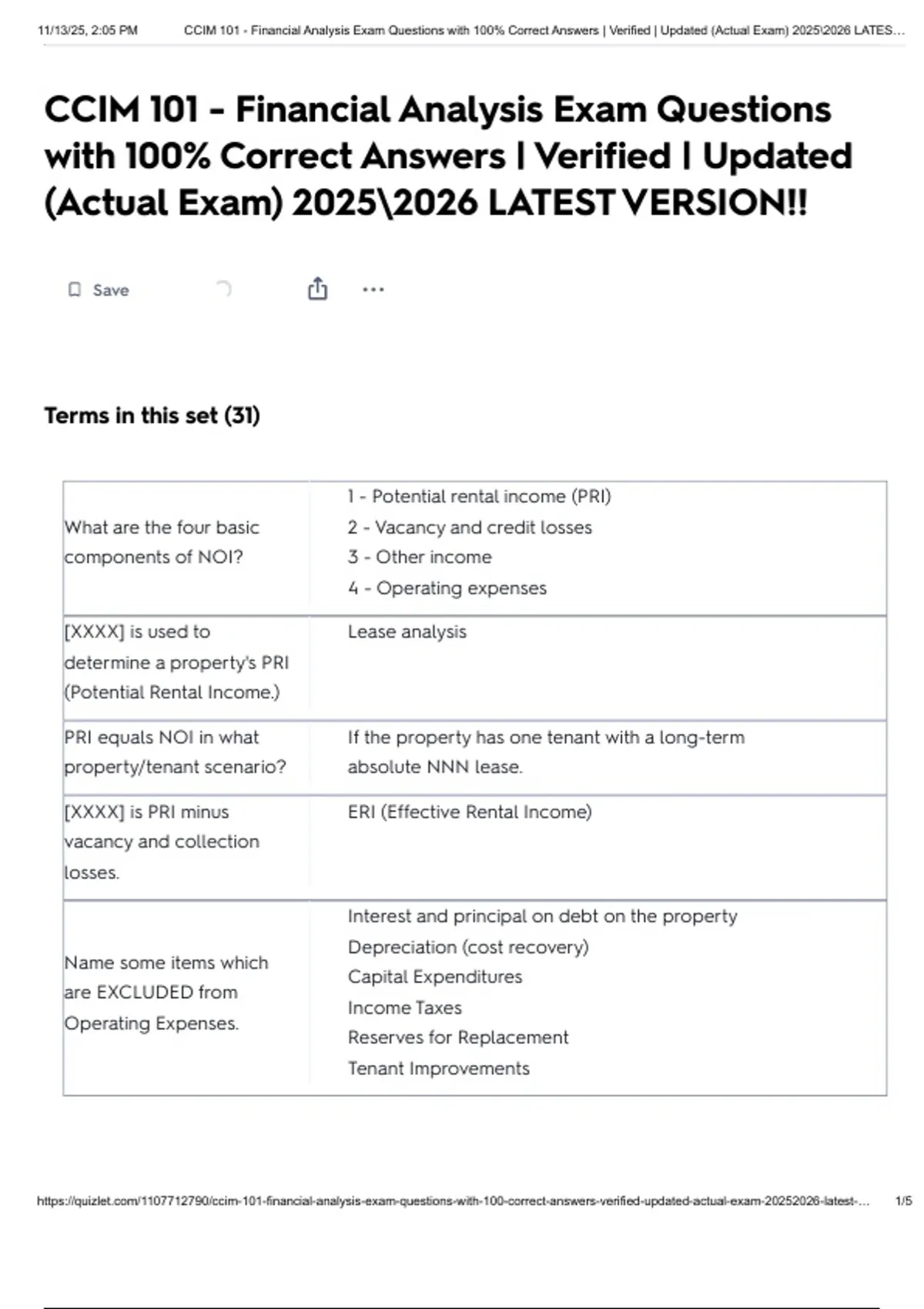 11/13/25, 2:05 PM CCIM 101 - Financial Analysis Exam Questions with 100% Correct Answers | Verified | Updated (Actual Exam) 2025\2026 LATES…