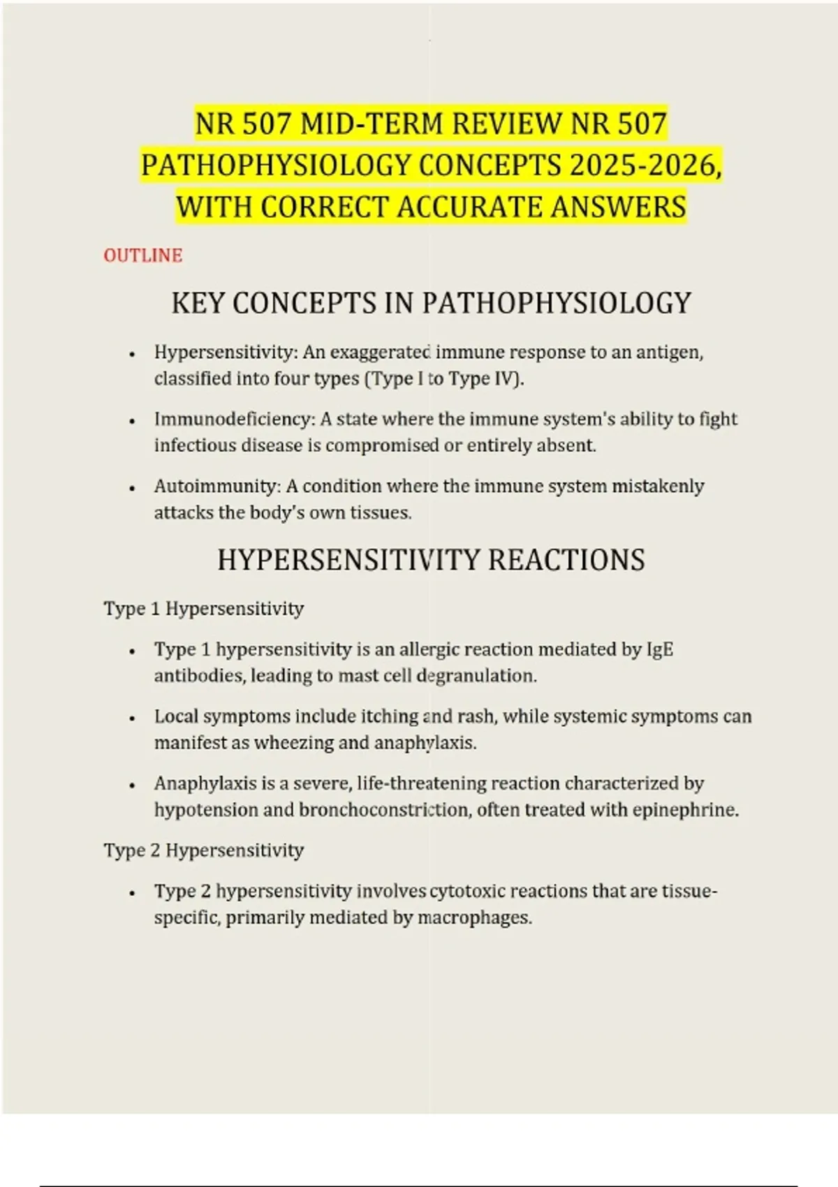 NR 507 MID-TERM REVIEW NR 507 PATHOPHYSIOLOGY CONCEPTS , WITH CORRECT ACCURATE ANSWERS