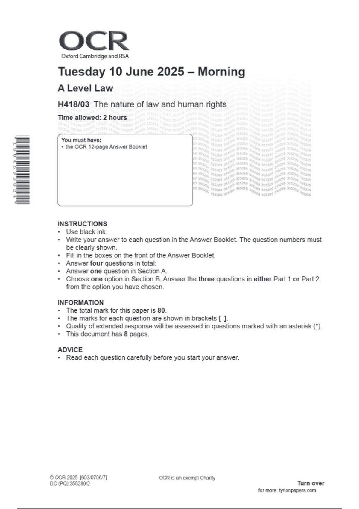 OCR A LEVEL LAW H418/03 JUNE 2025 QUESTION PAPER: The nature of law and human rights