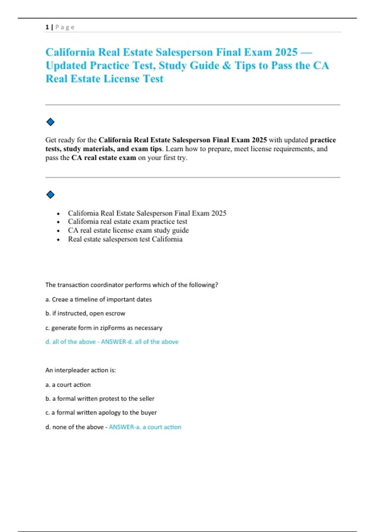 Get ready for the California Real Estate Salesperson Final Exam 2025 with updated practice