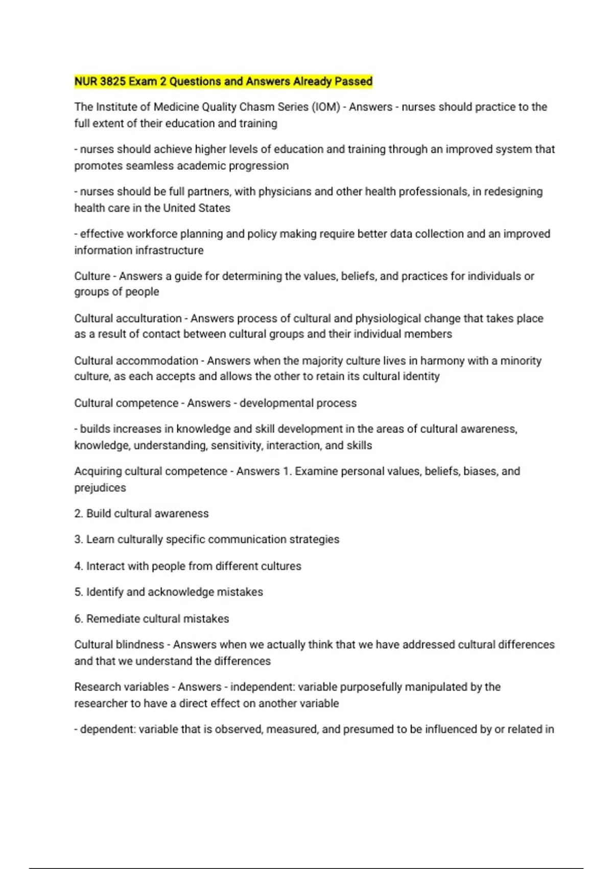 NUR 3825 Exam 2 Questions and Answers Already Passed The Institute of Medicine Quality Chasm Series (IOM) - Answers - nurses should practice to the full extent of their education and training - nurses should achieve higher levels of education and training through an improved system that promotes seamless academic progression - nurses should be full partners, with physicians and other health professionals, in redesigning health care in the United States - effective workforce planning and policy making require better data collection and an improved information infrastructure Culture - Answers a guide for determining the values, beliefs, and practices for individuals or groups of people Cultural acculturation - Answers process of cultural and physiological change that takes place as a result of contact between cultural groups and their individual members Cultural accommodation - Answers when the majority culture lives in harmony with a minority culture, as each accepts and allows the other to retain its cultural identity Cultural competence - Answers - developmental process - builds increases in knowledge and skill development in the areas of cultural awareness, knowledge, understanding, sensitivity, interaction, and skills Acquiring cultural competence - Answers 1. Examine personal values, beliefs, biases, and prejudices 2. Build cultural awareness 3. Learn culturally specific communication strategies 4. Interact with people from different cultures 5. Identify and acknowledge mistakes 6. Remediate cultural mistakes Cultural blindness - Answers when we actually think that we have addressed cultural differences and that we understand the differences Research variables - Answers - independent: variable purposefully manipulated by the researcher to have a direct effect on another variable - dependent: variable that is observed, measured, and presumed to be influenced by or related in some special way to the independent variable National Patient Safety Goals - Answers - improve accuracy of client identification. - improve effectiveness of communication among caregivers. - improve safety of using medications. - reduce risk of health-care-associated infections. - identify client safety risks inherent in its patient population. Purpose of National Patient Safety Goals - Answers prevent errors that compromise client safety in hospitals, home care agencies, outpatient facilities, and laboratories Physiologic variances in culture - Answers - federal government has identified medical research across gender and ethnic groups as a research priority: pharmacogenetics and genetic research - professional nurses should be aware of differing responses to medications to anticipate potential adverse effects. Purpose of nursing research - Answers - Articulate the values of research and its application relative to health care setting and practice. - Identify questions in the health care setting and practice that can be answered by nursing research. - Use current evidence-based knowledge to guide practice. - Incorporate evidence when initiating nursing practice changes - Participate in the formation of evidence-based practice through research. - Promote ethical research in practice in the healthcare setting. - Appraise nursing research studies for optimal application in practice and the health care setting. - Share peer-reviewed research with colleagues to integrate knowledge into nursing practice.