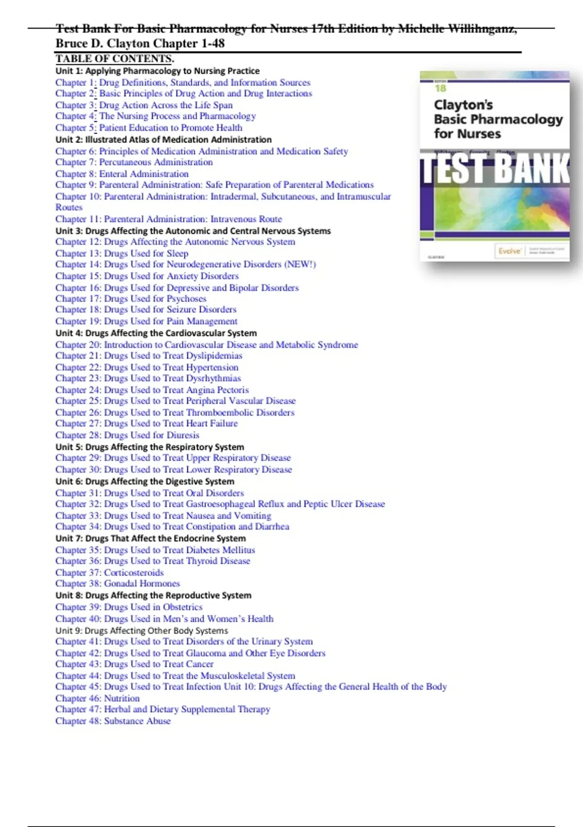 Test Bank For Basic Pharmacology for Nurses 17th Edition by Michelle J. Willihnganz MS RN CNE, Bruce D. Clayton BS PharmD RPh Chapter 1-48