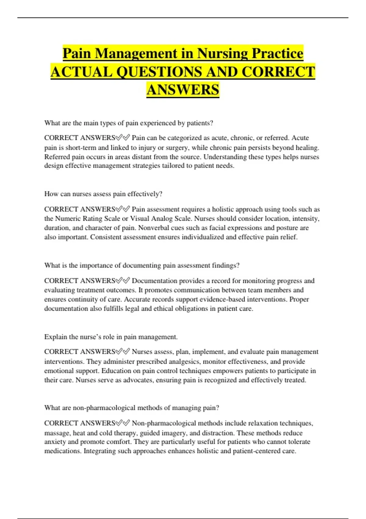 Pain Management in Nursing Practice ACTUAL QUESTIONS AND CORRECT ANSWERS What are the main types of pain experienced by patients? CORRECT ANSWERS Pain can be categorized as acute, chronic, or referred. Acute pain is short-term and linked to injury or surgery, while chronic pain persists beyond healing. Referred pain occurs in areas distant from the source. Understanding these types helps nurses design effective management strategies tailored to patient needs. How can nurses assess pain effectively? CORRECT ANSWERS Pain assessment requires a holistic approach using tools such as the Numeric Rating Scale or Visual Analog Scale. Nurses should consider location, intensity, duration, and character of pain. Nonverbal cues such as facial expressions and posture are also important. Consistent assessment ensures individualized and effective pain relief. What is the importance of documenting pain assessment findings? CORRECT ANSWERS Documentation provides a record for monitoring progress and evaluating treatment outcomes. It promotes communication between team members and ensures continuity of care. Accurate records support evidence-based interventions. Proper documentation also fulfills legal and ethical obligations in patient care. Explain the nurse’s role in pain management. CORRECT ANSWERS Nurses assess, plan, implement, and evaluate pain management interventions. They administer prescribed analgesics, monitor effectiveness, and provide emotional support. Education on pain control techniques empowers patients to participate in their care. Nurses serve as advocates, ensuring pain is recognized and effectively treated. What are non-pharmacological methods of managing pain?