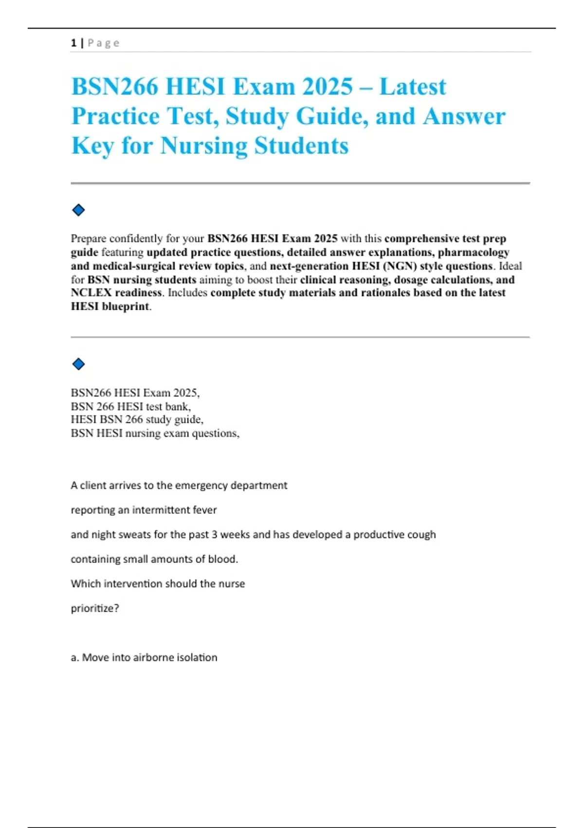 BSN266 HESI Exam – Latest Practice Test, Study Guide, and Answer Key for Nursing Students