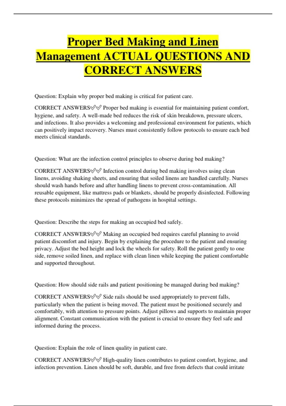 CORRECT ANSWERS✅✅ High-quality linen contributes to patient comfort, hygiene, and