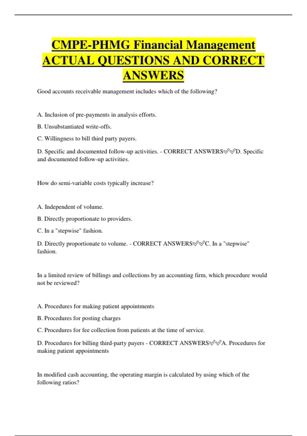 CMPE-PHMG Financial Management ACTUAL QUESTIONS AND CORRECT ANSWERS Good accounts receivable management includes which of the following? A. Inclusion of pre-payments in analysis efforts. B. Unsubstantiated write-offs. C. Willingness to bill third party payers. D. Specific and documented follow-up activities. - CORRECT ANSWERSD. Specific and documented follow-up activities. How do semi-variable costs typically increase? A. Independent of volume. B. Directly proportionate to providers. C. In a "stepwise" fashion. D. Directly proportionate to volume. - CORRECT ANSWERSC. In a "stepwise" fashion. In a limited review of billings and collections by an accounting firm, which procedure would not be reviewed? A. Procedures for making patient appointments B. Procedures for posting charges C. Procedures for fee collection from patients at the time of service. D. Procedures for billing third-party payers - CORRECT ANSWERSA. Procedures for making patient appointments In modified cash accounting, the operating margin is calculated by using