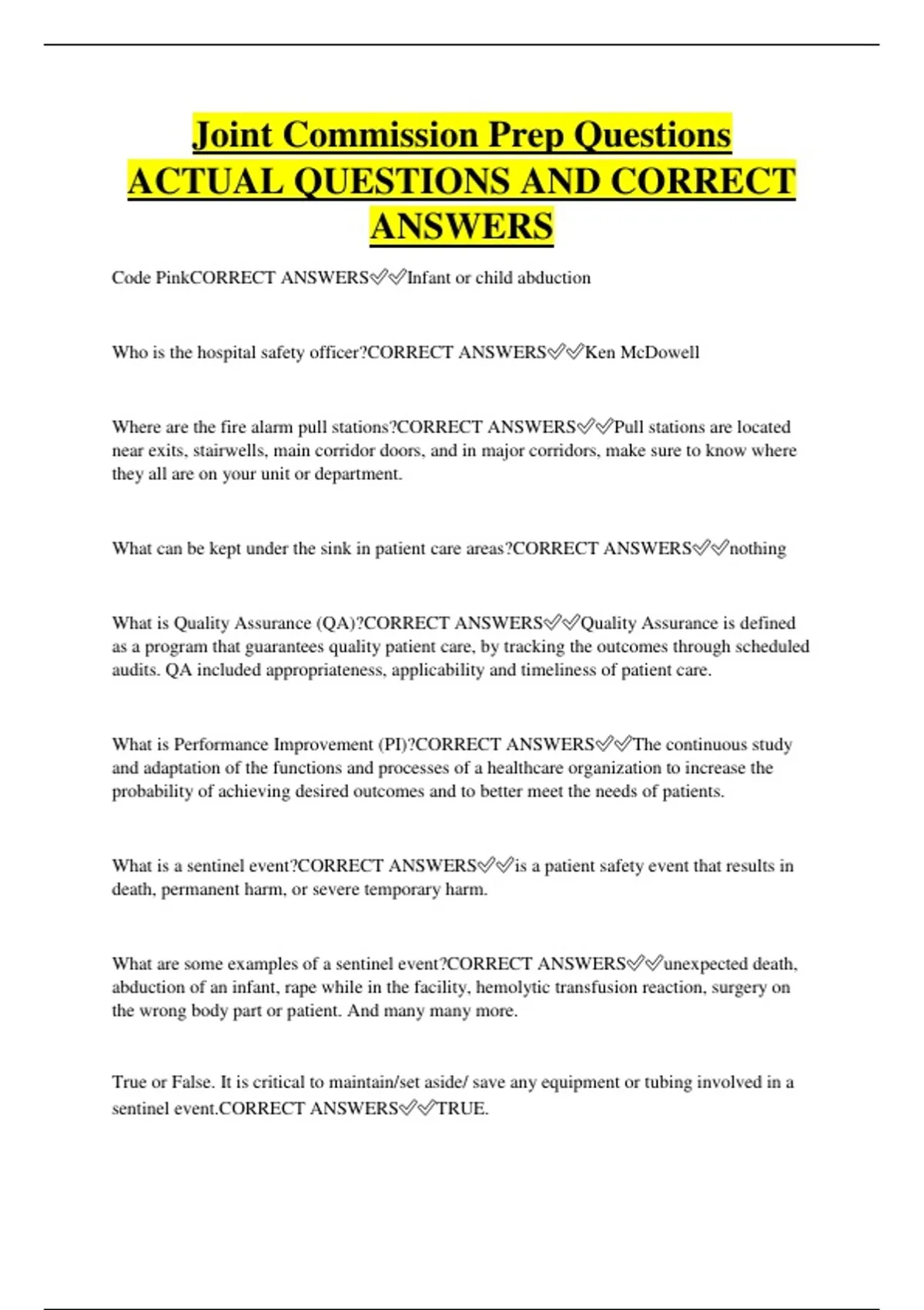 Joint Commission Prep Questions ACTUAL QUESTIONS AND CORRECT ANSWERS Code PinkCORRECT ANSWERSInfant or child abduction Who is the hospital safety officer?CORRECT ANSWERSKen McDowell Where are the fire alarm pull stations?CORRECT ANSWERSPull stations are located near exits, stairwells, main corridor doors, and in major corridors, make sure to know where they all are on your unit or department. What can be kept under the sink in patient care areas?CORRECT ANSWERSnothing What is Quality Assurance (QA)?CORRECT ANSWERSQuality Assurance is defined as a program that guarantees quality patient care, by tracking the outcomes through scheduled audits. QA included appropriateness, applicability and timeliness of patient care. What is Performance Improvement (PI)?CORRECT ANSWERSThe continuous study and adaptation of the functions and processes of a healthcare organization to increase the probability of achieving desired outcomes and to better meet the needs of patients. What is a sentinel event?CORRECT ANSWERSis a patient safety event that results in death, permanent harm, or severe temporary harm. What are some examples of a sentinel event?CORRECT ANSWERSunexpected death, abduction of an infant, rape while in the facility, hemolytic transfusion reaction, surgery on the wrong body part or patient. And many many more. True or False. It is critical to maintain/set aside/ save any equipment or tubing involved in a sentinel event.CORRECT ANSWERSTRUE. How are Patients/ Families informed of their rights and responsibilit