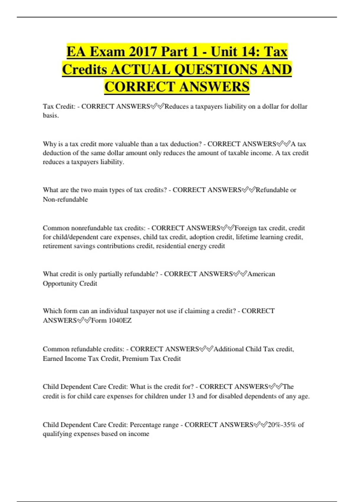 Tax Credit: - CORRECT ANSWERS✅✅Reduces a taxpayers liability on a dollar for dollar