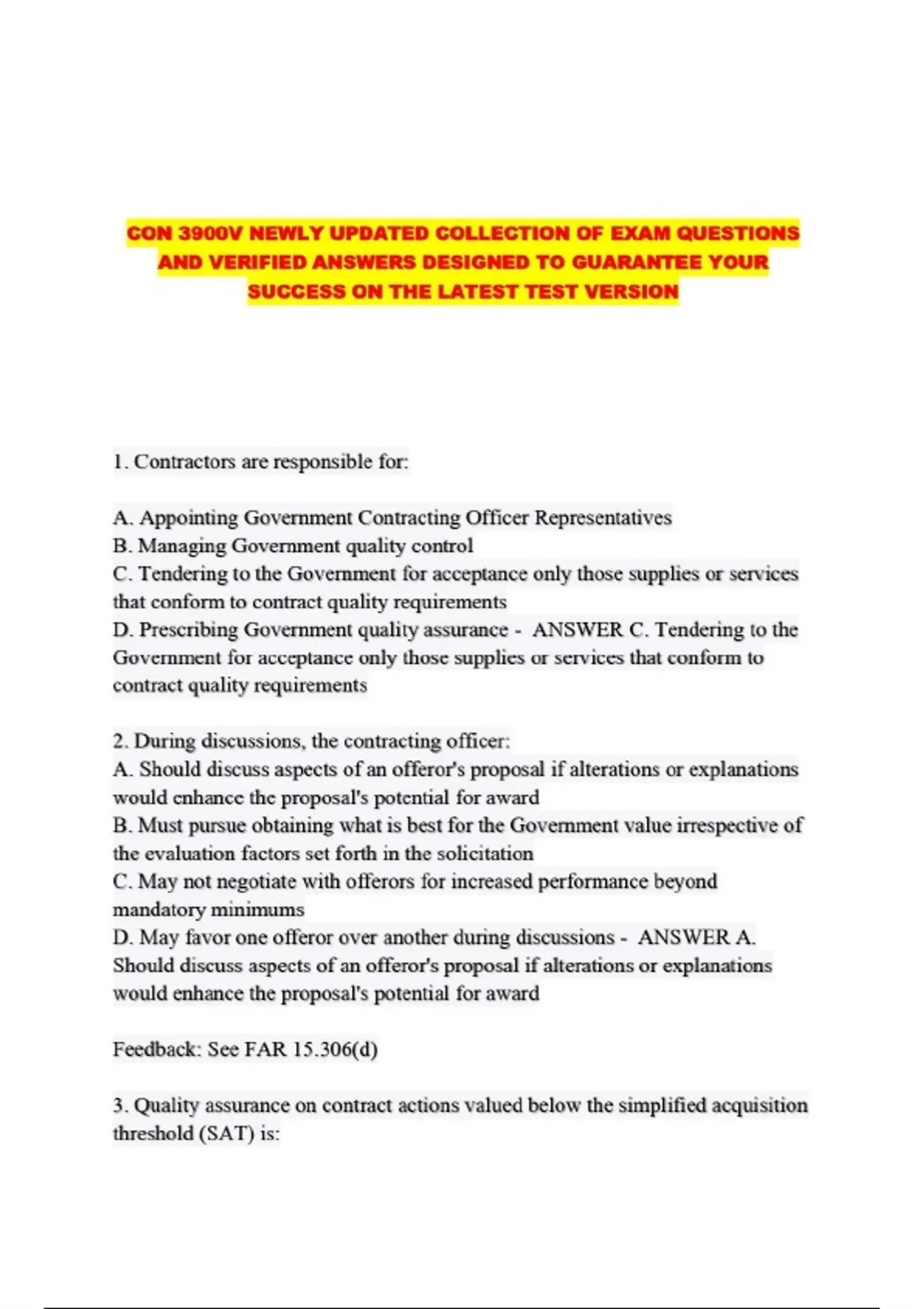 CON3900/ CON 3900 PACKAGED EXAMS: NEW VERSION EXAM QUESTIONS AND VERIFIED ANSWERS PRESENTED IN A CLEAR FORMAT TO HELP YOU PASS WITHOUT STRESS