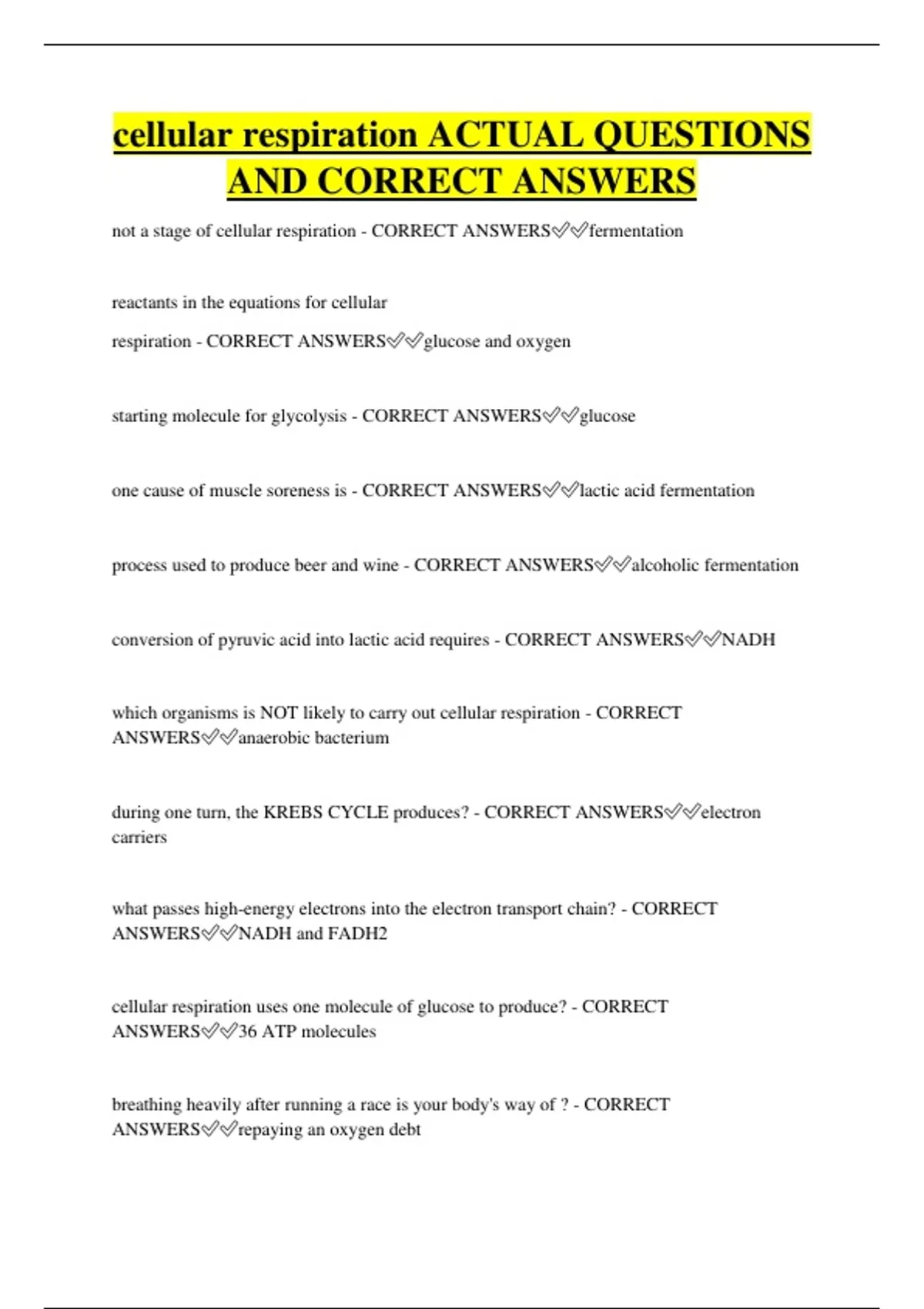 cellular respiration ACTUAL QUESTIONS AND CORRECT ANSWERS not a stage of cellular respiration - CORRECT ANSWERSfermentation reactants in the equations for cellular respiration - CORRECT ANSWERSglucose and oxygen starting molecule for glycolysis - CORRECT ANSWERSglucose one cause of muscle soreness is - CORRECT ANSWERSlactic acid fermentation process used to produce beer and wine - CORRECT ANSWERSalcoholic fermentation conversion of pyruvic acid into lactic acid requires - CORRECT ANSWERSNADH which organisms is NOT likely to carry out cellular respiration - CORRECT ANSWERSanaerobic bacterium during one turn, the KREBS CYCLE produces? - CORRECT ANSWERSelectron carriers what passes high-energy electrons into the electron transport chain? - CORRECT ANSWERSNADH and FADH2 cellular respiration uses one molecule of glucose to produce? - CORRECT ANSWERS36 ATP molecules breathing heavily after running a race is your body's way of ? - CORRECT ANSWERSrepaying an oxygen debt NOT source of energy during exercise is? - CORRECT ANSWERSalcoholic fermentation process does NOT release energy from glucose? - CORRECT ANSWERSphotosynthesis photosynthesis is to chloroplast as cellular respiration is to? - CORRECT