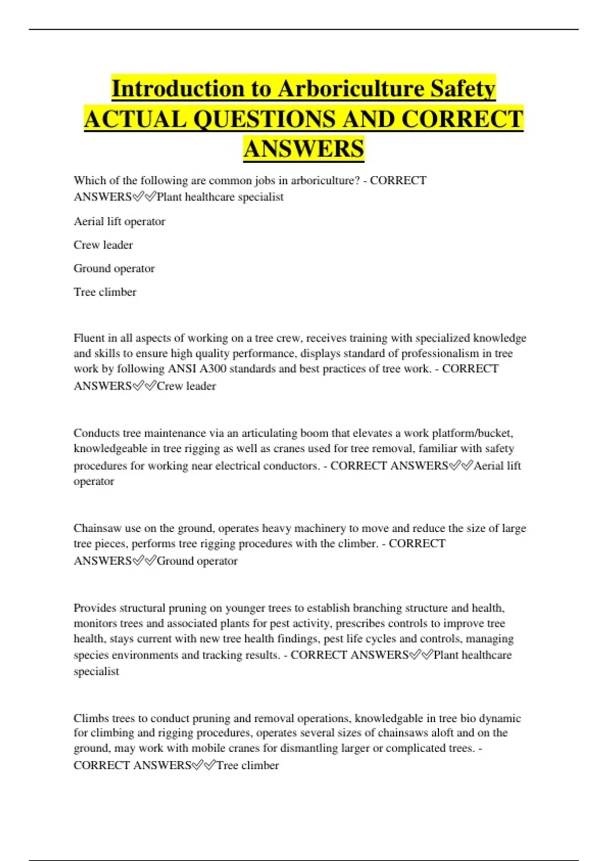 Introduction to Arboriculture Safety ACTUAL QUESTIONS AND CORRECT ANSWERS Which of the following are common jobs in arboriculture? - CORRECT ANSWERSPlant healthcare specialist Aerial lift operator Crew leader Ground operator Tree climber Fluent in all aspects of working on a tree crew, receives training with specialized knowledge and skills to ensure high quality performance, displays standard of professionalism in tree work by following ANSI A300 standards and best practices of tree work. - CORRECT ANSWERSCrew leader Conducts tree maintenance via an articulating boom that elevates a work platform/bucket, knowledgeable in tree rigging as well as cranes used for tree removal, familiar with safety procedures for working near electrical conductors. - CORRECT ANSWERSAerial lift operator Chainsaw use on the ground, operates heavy machinery to move and reduce the size of large tree pieces, performs tree rigging procedures with the climber. - CORRECT ANSWERSGround operator Provides structural pruning on younger trees to establish branching structure and health, monitors trees and associated plants for pest activity, prescribes controls to improve tree health, stays current with new tree health findings, pest life cycles and controls, managing species environments and tracking results. - CORRECT ANSWERSPlant healthcare specialist Climbs trees to conduct pruning and removal operations, knowledgable in tree bio dynamic for climbing and rigging procedures, operates several sizes of chainsaws aloft and on the ground, may work with mobile cranes for dismantling larger or complicated trees. - CORRECT ANSWERSTree climber ANSI Z133 is the safety standard for tree care operations in the United States. - CORRECT ANSWERSTrue The stated purpose of ANSI Z133 is to provide safety standard for ________ and other workers engaged in _______. - CORRECT ANSWERSarborists arbocultureal operations Portions of the ANSI Z133 safety standards have been adopted by ______. - CORRECT ANSWERSOSHA The ANSI Z133 standards are developed by _______. - CORRECT ANSWERSindustry representatives A ______ statement denotes a mandatory requirement. - CORRECT ANSWERSshall A _____ statement denotes an advisory recommendation. - CORRECT ANSWERSshould Which of the following are possible consequences of failure to follow ANSI Z133 safety standards? - CORRECT ANSWERSLawsuit OSHA citations Injury or death Disciplinary action Which of the following are not covered by ANSI Z133? - CORRECT ANSWERSTree biology and identification Chipper Operation - CORRECT ANSWERSHelmet