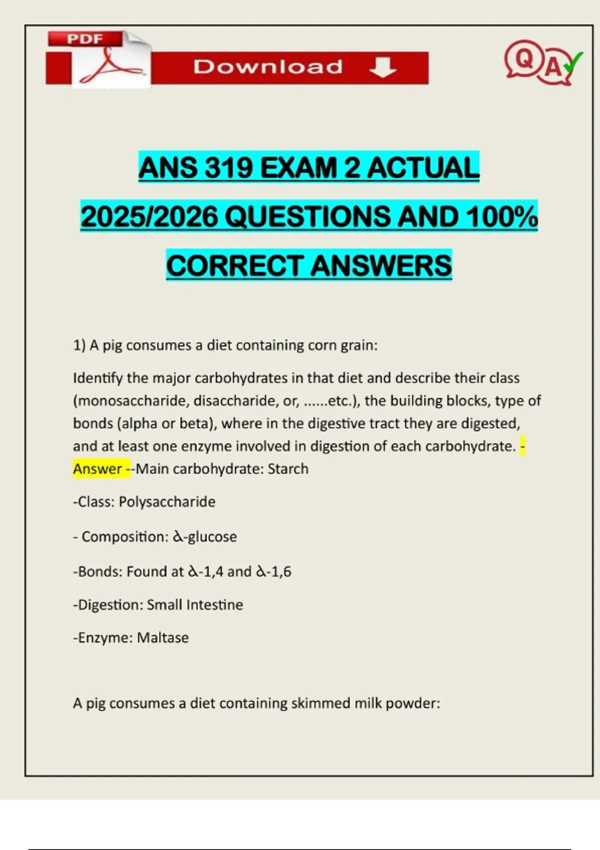 ANS 319 EXAM 2 ACTUAL 2025/2026 QUESTIONS AND 100% CORRECT ANSWERS 1) A pig consumes a diet containing corn grain: Identify the major carbohydrates in that diet and describe their class (monosaccharide, disaccharide, or, ......etc.), the building blocks, type of bonds (alpha or beta), where in the digestive tract they are digested, and at least one enzyme involved in digestion of each carbohydrate. - Answer --Main carbohydrate: Starch -Class: Polysaccharide - Composition: -glucose -Bonds: Found at -1,4 and -1,6 -Digestion: Small Intestine -Enzyme: Maltase A pig consumes a diet containing skimmed milk powder:Need assistance on Online classes, Exams & Assignments? Reach out for instant help!! Full Course Assistance, Plagiarism-free Essay Writing, Research Paper, Dissertation, Discussion Posts, etc…. Confidential & Secure services. Tutors are available for all subjects! Email now at: Identify the major carbohydrates in that diet and describe their class (monosaccharide, disaccharide, or, ......etc.), the building blocks, type of bonds (alpha or beta), where in the digestive tract they are digested, and at least one enzyme involved in digestion of each carbohydrate. - Answer -Main carbohydrate: Lactose -Class: Disaccharide -Composition: Glucose and G