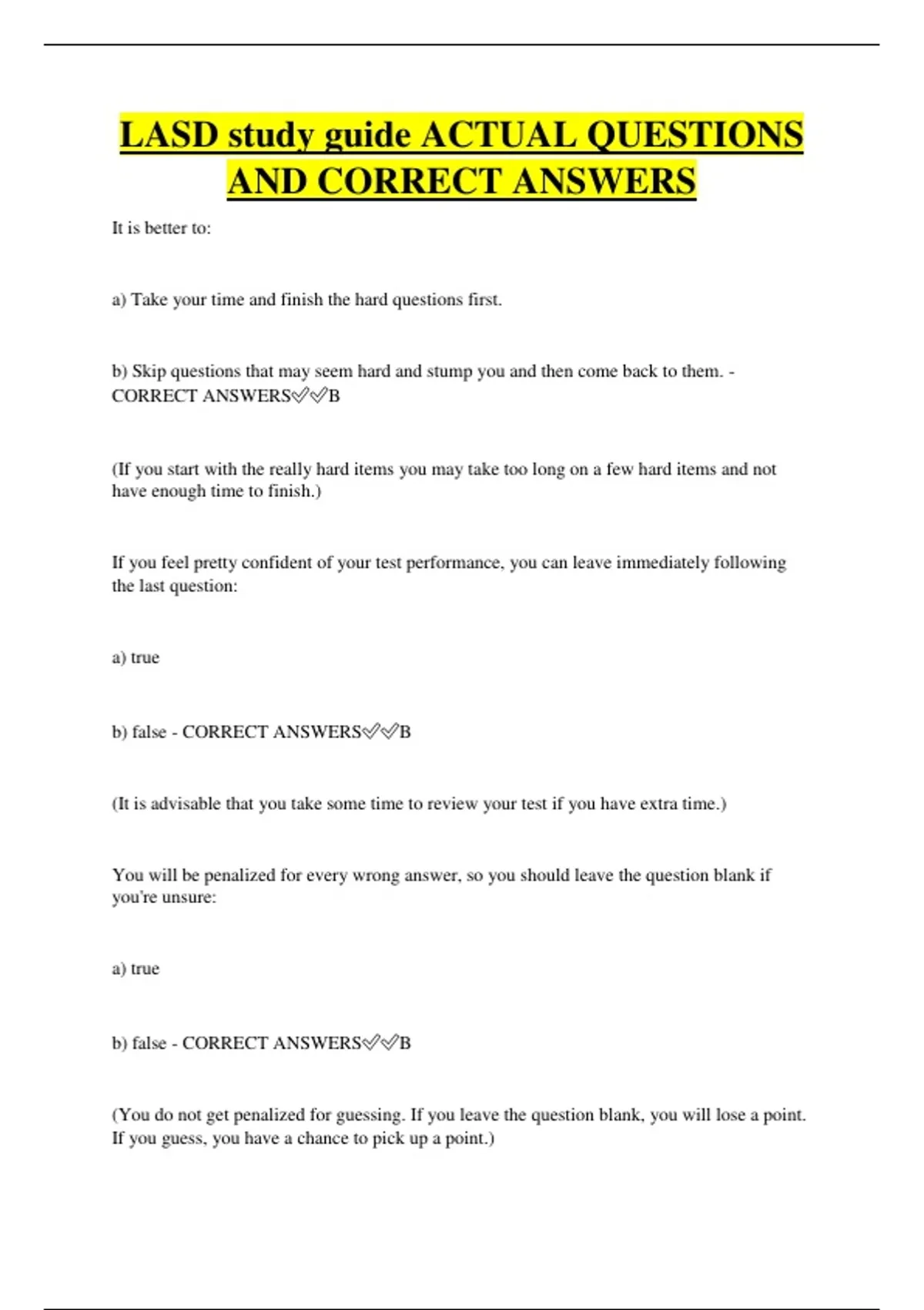 LASD study guide ACTUAL QUESTIONS AND CORRECT ANSWERS It is better to: a) Take your time and finish the hard questions first. b) Skip questions that may seem hard and stump you and then come back to them. - CORRECT ANSWERSB (If you start with the really hard items you may take too long on a few hard items and not have enough time to finish.) If you feel pretty confident of your test performance, you can leave immediately following the last question: a) true b) false - CORRECT ANSWERSB (It is advisable that you take some time to review your test if you have extra time.) You will be penalized for every wrong answer, so you should leave the question blank if you're unsure: a) true b) false - CORRECT ANSWERSB (You do not get penalized for guessing. If you leave the question blank, you will lose a point. If you guess, you have a chance to pick up a point.) Select the title which most closely describes the content of the statement. 1. The United Nations, an international body of nations, was established after World War II in an effort to promote world peace. a) The legacy of World War II b) The founding of the United Nations c) Promoting World Peace d) International Organizations - CORRECT ANSWERSB