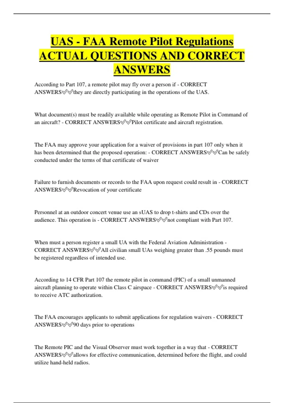 UAS - FAA Remote Pilot Regulations ACTUAL QUESTIONS AND CORRECT ANSWERS According to Part 107, a remote pilot may fly over a person if - CORRECT ANSWERSthey are directly participating in the operations of the UAS. What document(s) must be readily available while operating as Remote Pilot in Command of an aircraft? - CORRECT ANSWERSPilot certificate and aircraft registration. The FAA may approve your application for a waiver of provisions in part 107 only when it has been determined that the proposed operation: - CORRECT ANSWERSCan be safely conducted under the terms of that certificate of waiver Failure to furnish documents or records to the FAA upon request could result in - CORRECT ANSWERSRevocation of your certificate Personnel at an outdoor concert venue use an sUAS to drop t-shirts and CDs over the audience. This operation is - CORRECT ANSWERSnot compliant with Part 107. When must a person register a small UA with the Federal Aviation Administration - CORRECT ANSWERSAll civilian small UAs weighing greater than .55 pounds must be registered regardless of intended use. According to 14 CFR Part 107 the remote pilot in command (PIC) of a small unmanned aircraft planning to operate within Class C airspace - CORRECT ANSWERSis required to receive ATC authorization. The FAA encourages applicants to submit applications for regulation waivers - CORRECT ANSWERS90 days prior to operations The Remote PIC and the Visual Observer must work together in a way that - CORRECT ANSWERSallows for effective communication, determined before the flight, and could utilize hand-held radios. A person applying for a remote pilot certificate must be at least - CORRECT