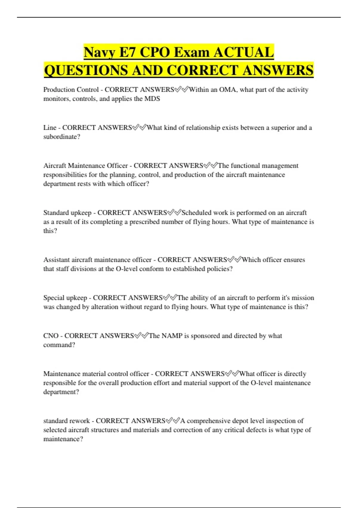 Navy E7 CPO Exam ACTUAL QUESTIONS AND CORRECT ANSWERS Production Control - CORRECT ANSWERSWithin an OMA, what part of the activity monitors, controls, and applies the MDS Line - CORRECT ANSWERSWhat kind of relationship exists between a superior and a subordinate? Aircraft Maintenance Officer - CORRECT ANSWERSThe functional management responsibilities for the planning, control, and production of the aircraft maintenance department rests with which officer? Standard upkeep - CORRECT ANSWERSScheduled work is performed on an aircraft as a result of its completing a prescribed number of flying hours. What type of maintenance is this? Assistant aircraft maintenance officer - CORRECT ANSWERSWhich officer ensures that staff divisions at the O-level conform to established policies? Special upkeep - CORRECT ANSWERSThe ability of an aircraft to perform it's mission was changed by alteration without regard to flying hours. What type of maintenance is this? CNO - CORRECT ANSWERSThe NAMP is sponsored and directed by what command? Maintenance material control officer - CORRECT ANSWERSWhat officer